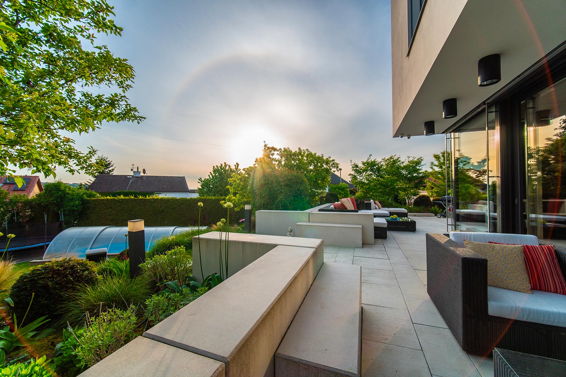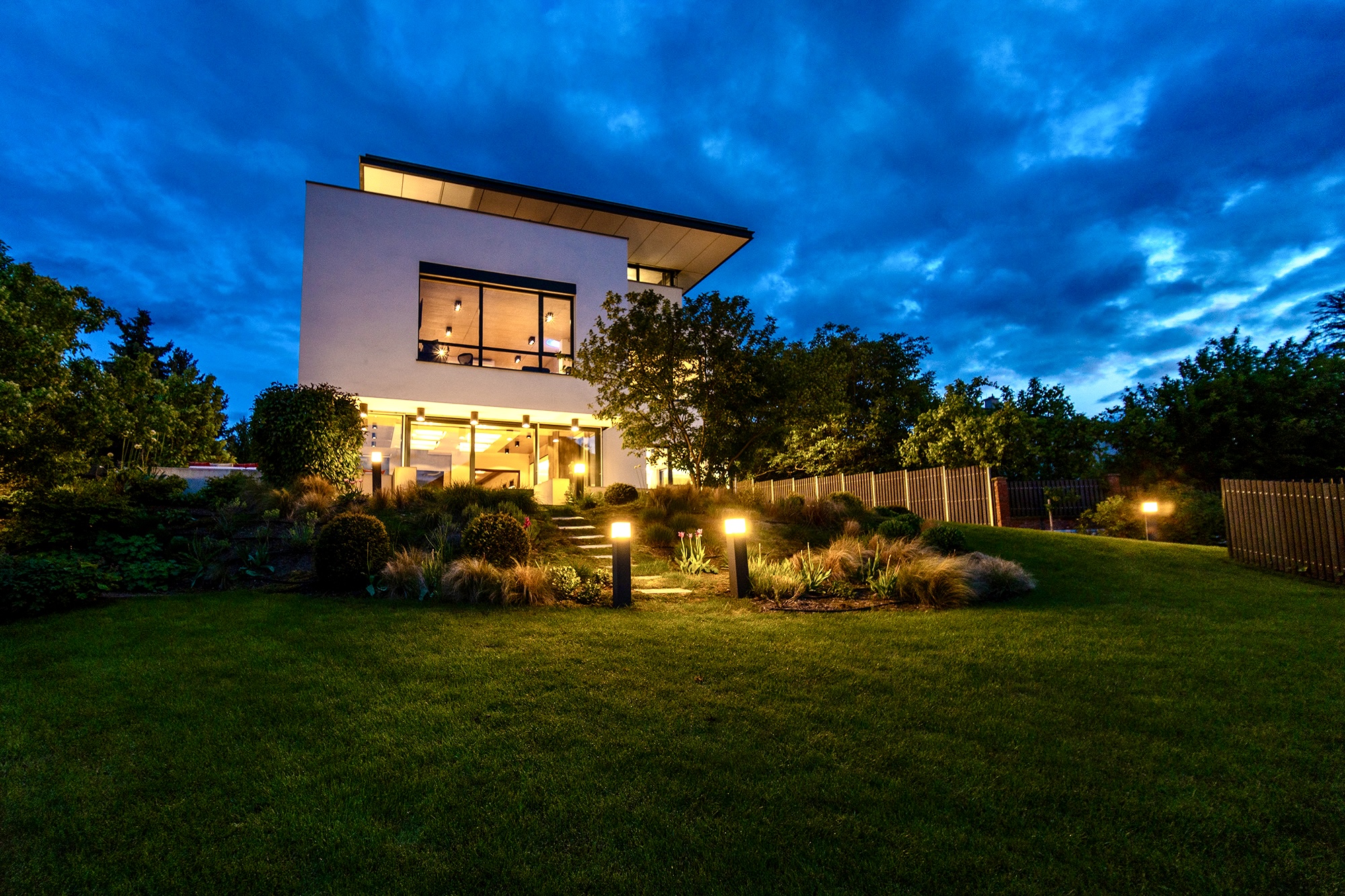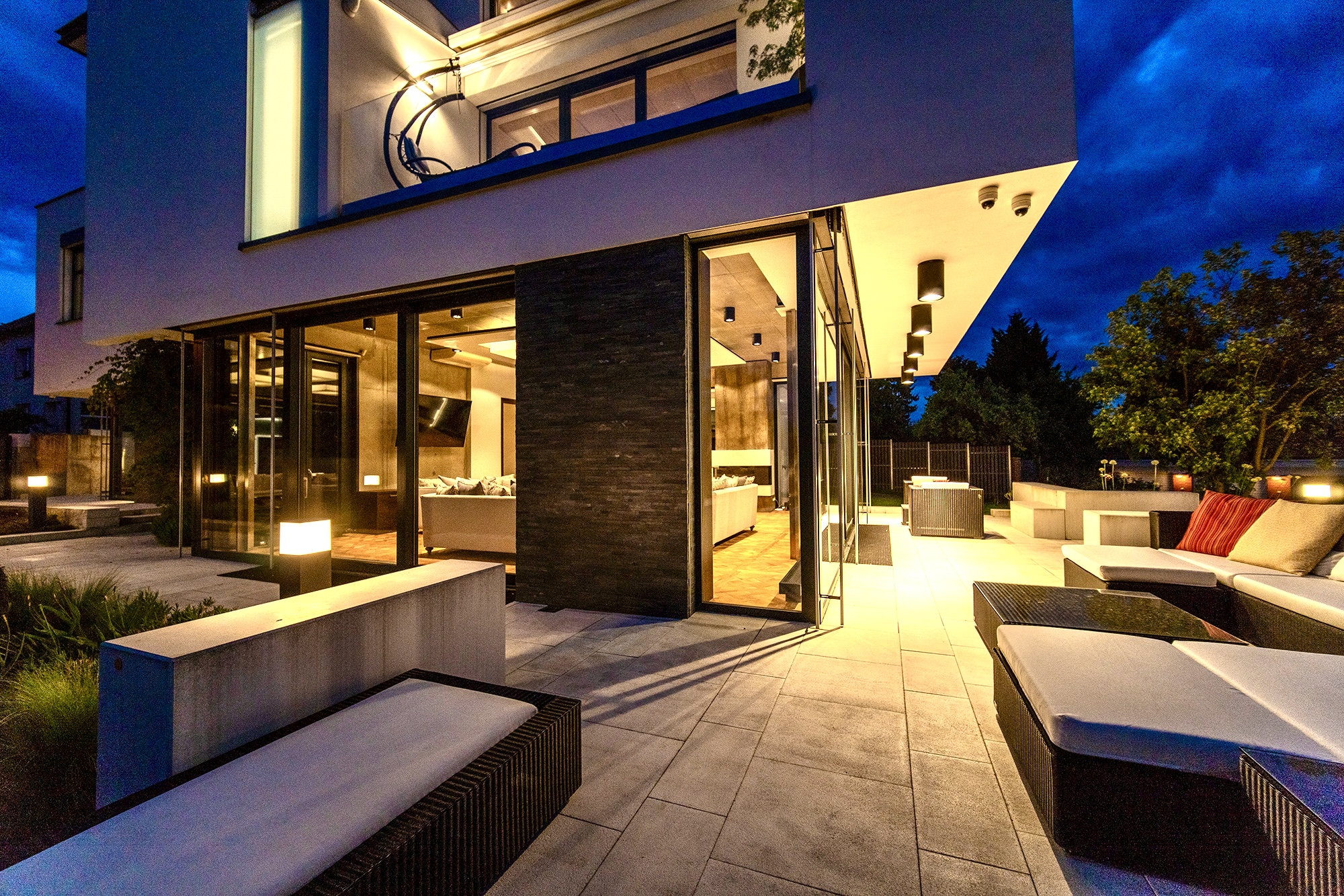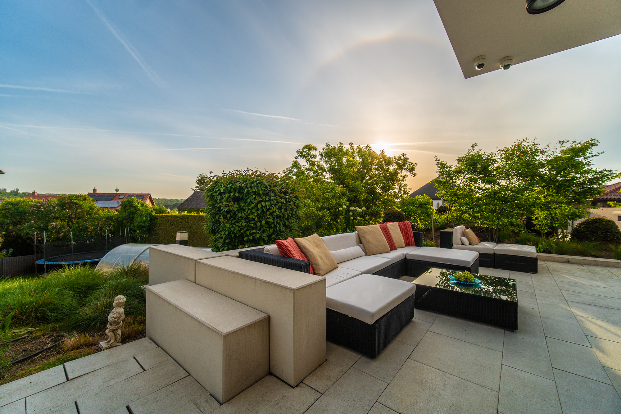 Z domu je přímý vstup na zahradní terasu s příjemným sezením. Zahrada je v noci příjemně osvětlena zahradními světly.