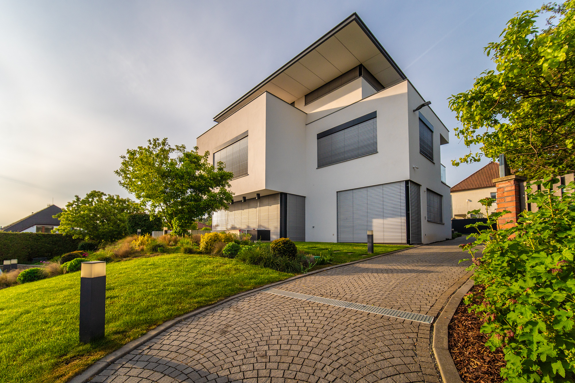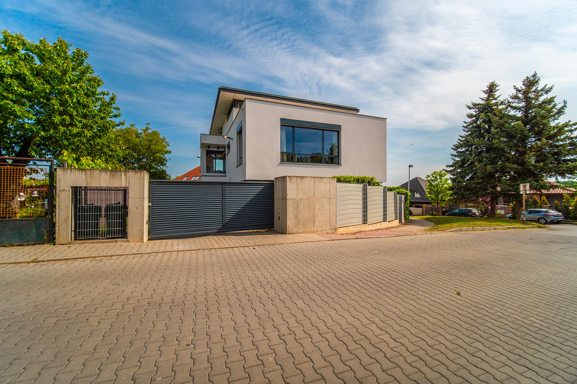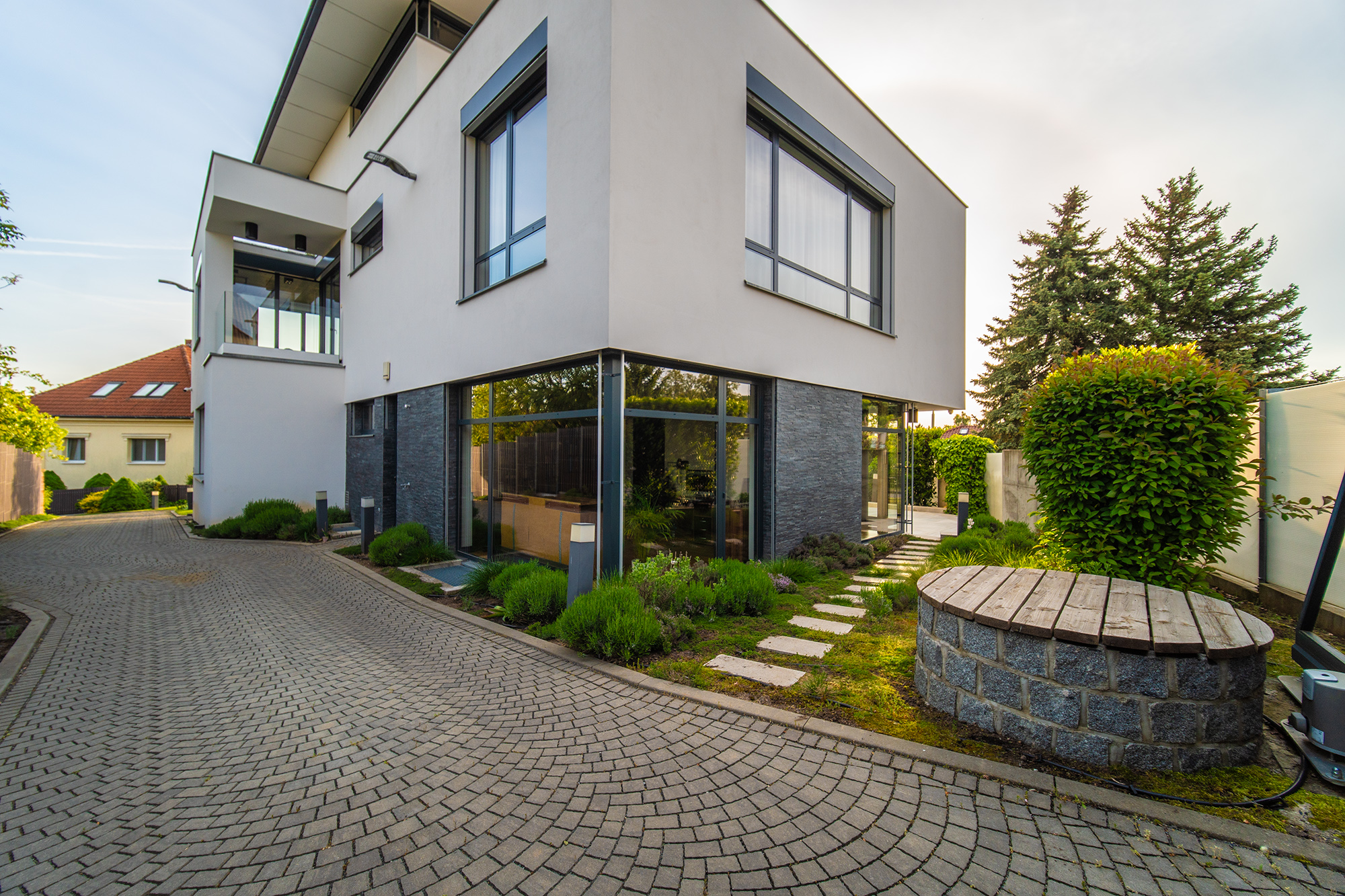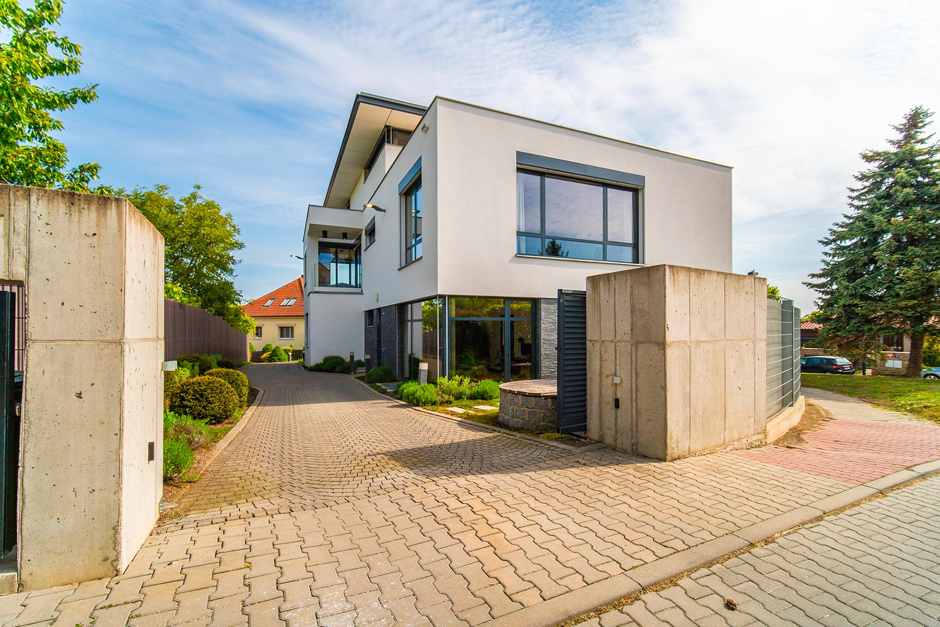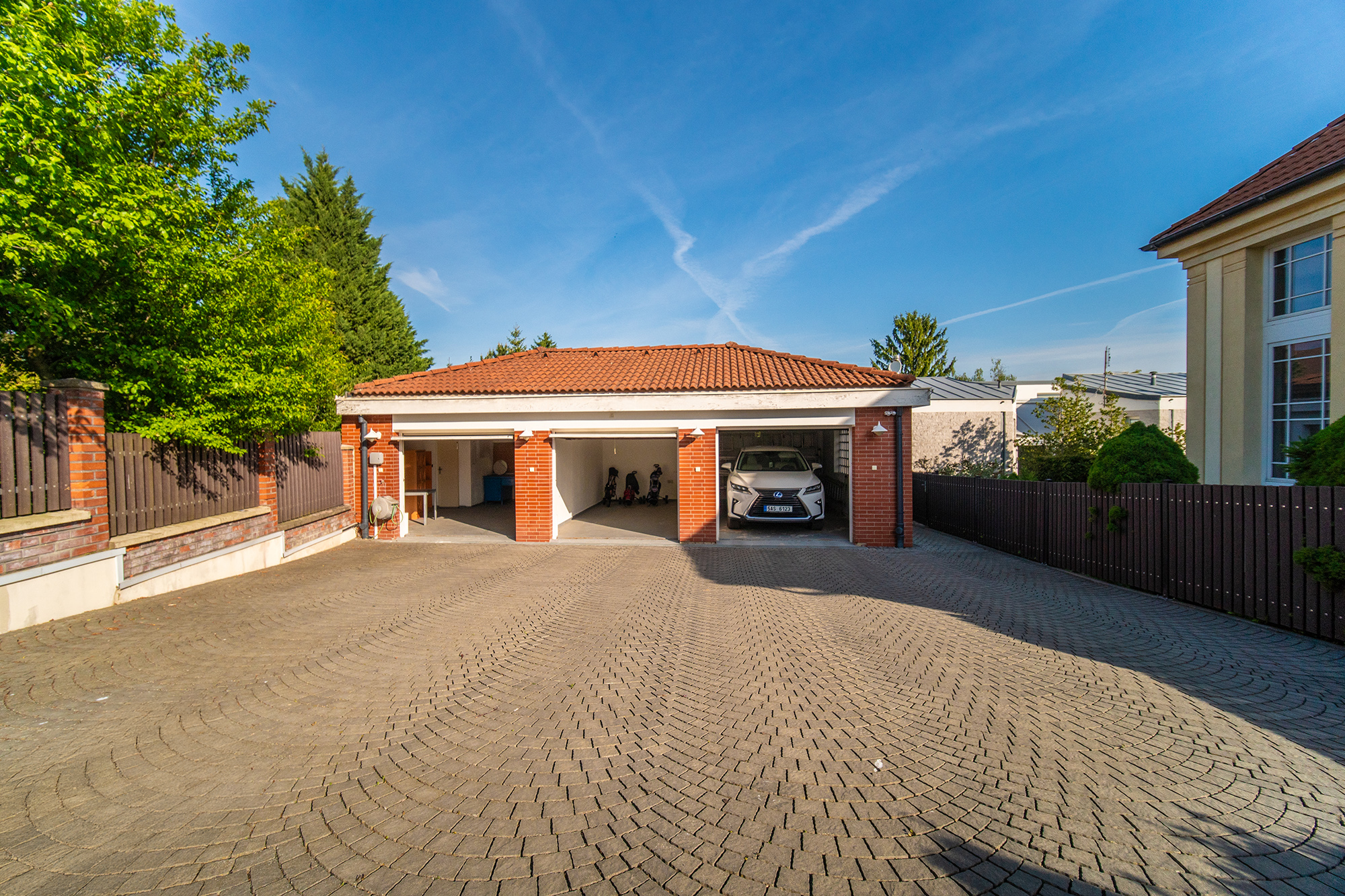 Vjezd do domu ze zajištěn přes automatickou bránu. Podél domu je již možné parkování pro několik aut a dlážděná cesta vede až do zadní části zahrady, kde je k dispozici další prostor pro parkování několika aut.
