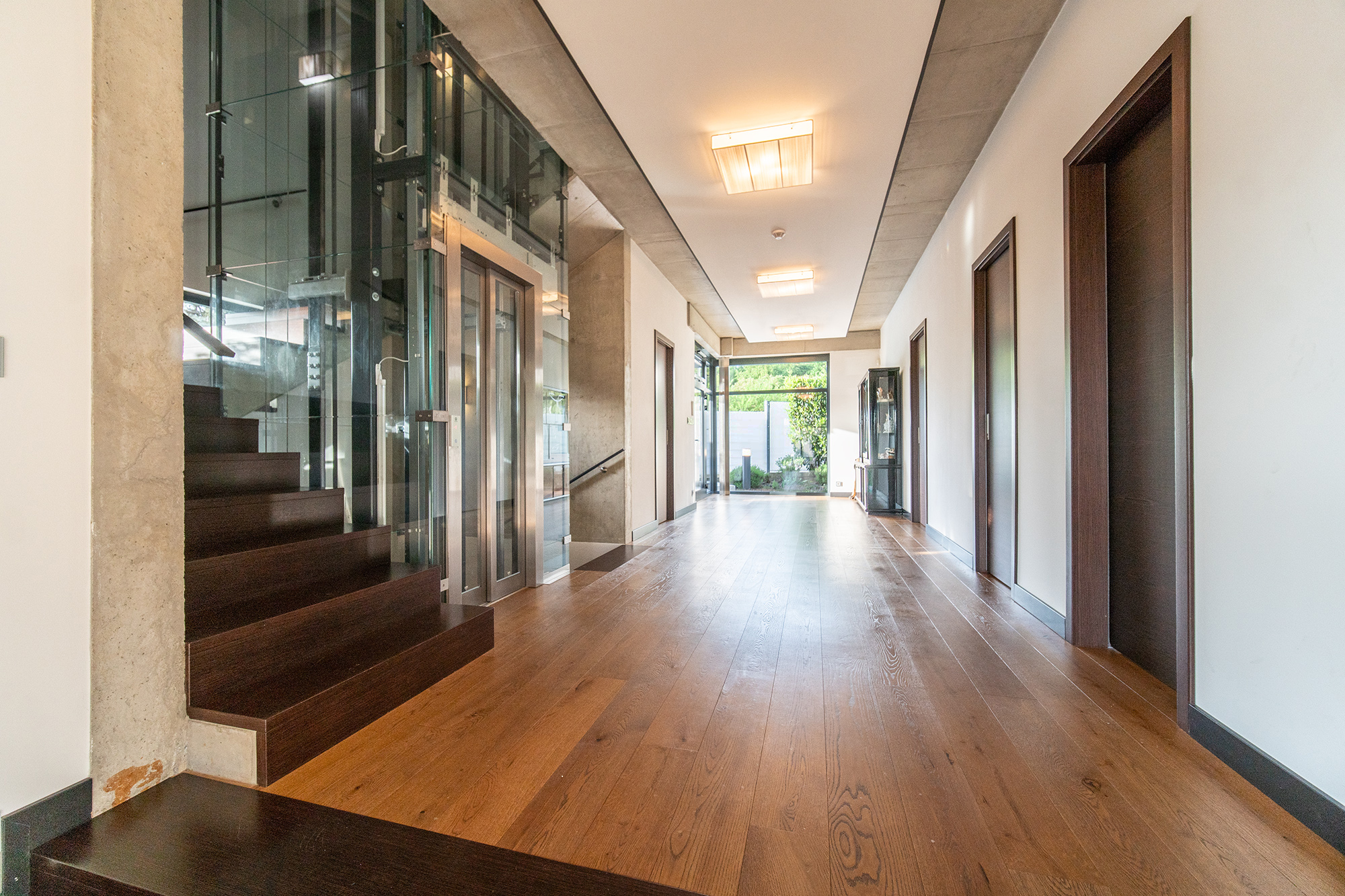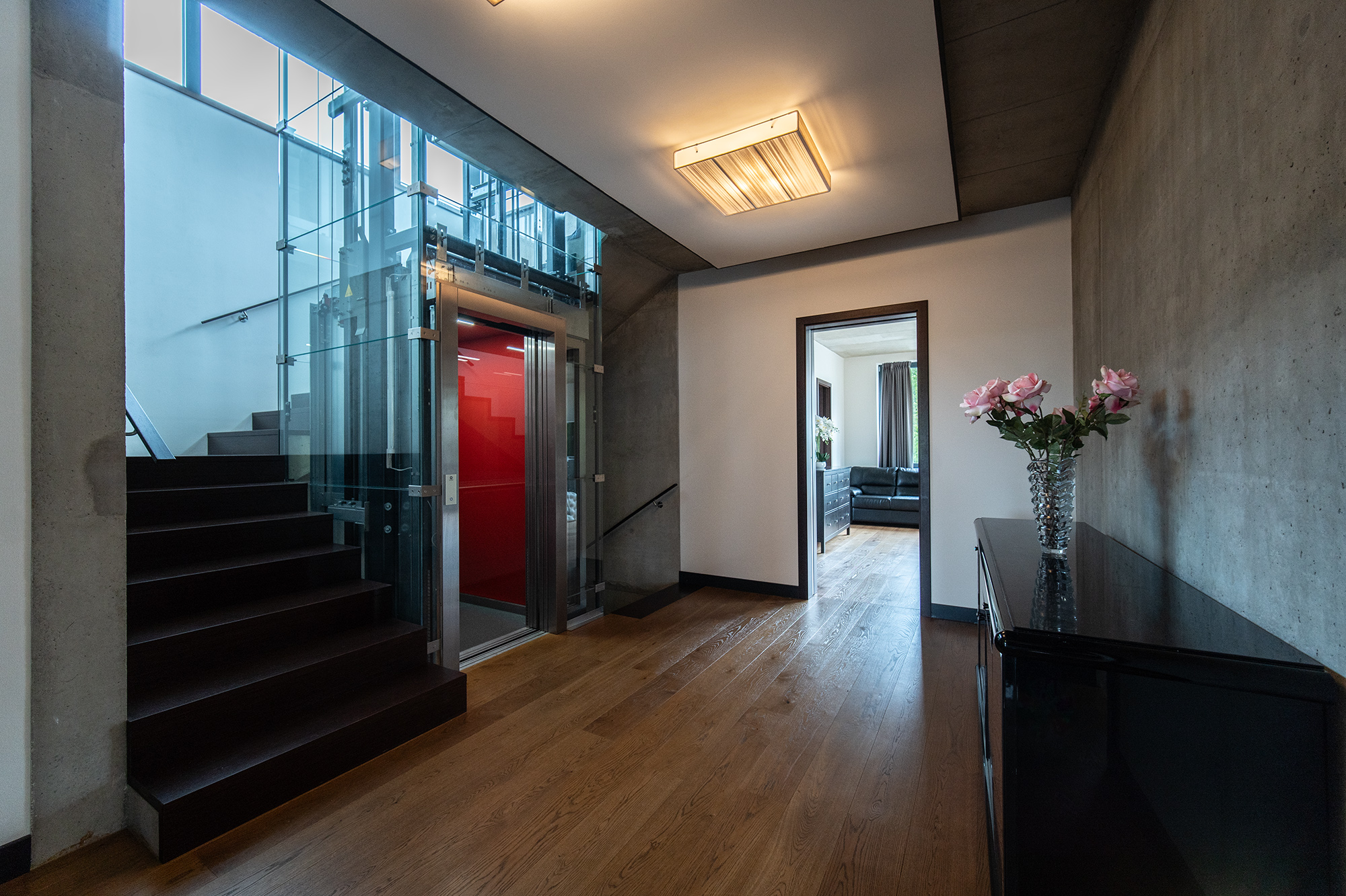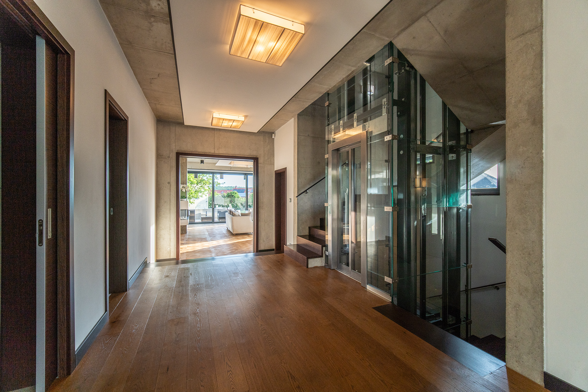 V 1. NP jsou prostory charakterově společného užívání. Hned po vstupu do domu je zádveří s navazující šatnou a pracovnou se samostatným vchodem ven, což je elegantní řešení v případě business využití. K dispozici je toaleta a oddělená koupelna, prosklený výtah zn. Schindler.