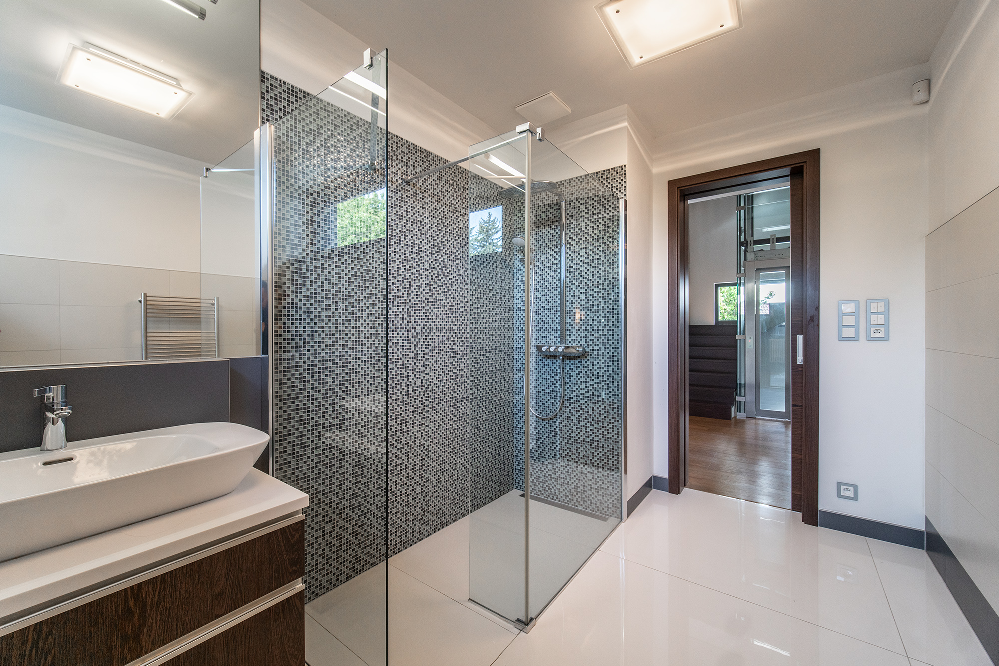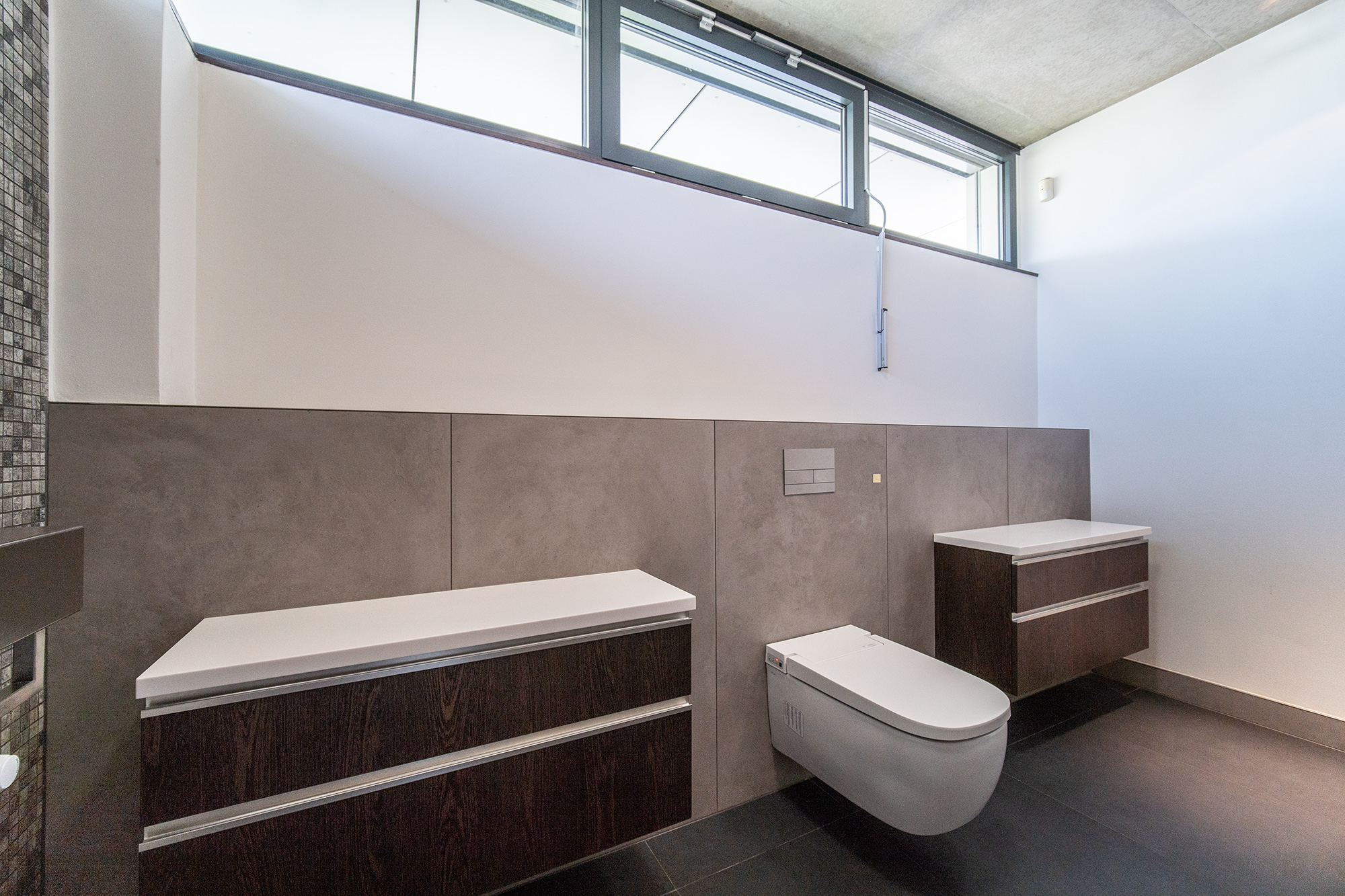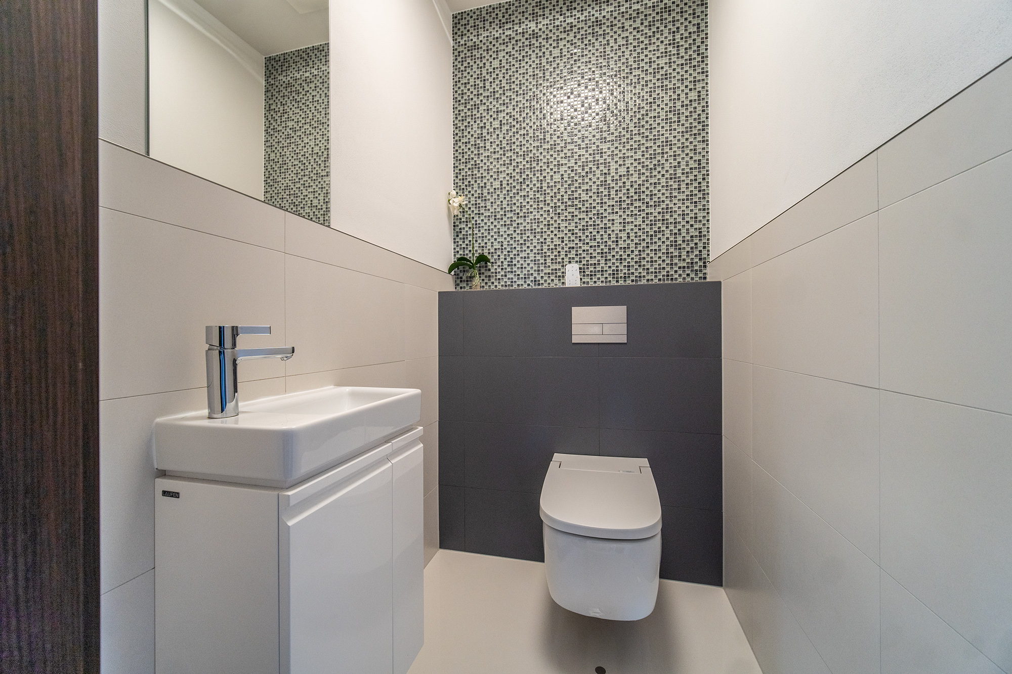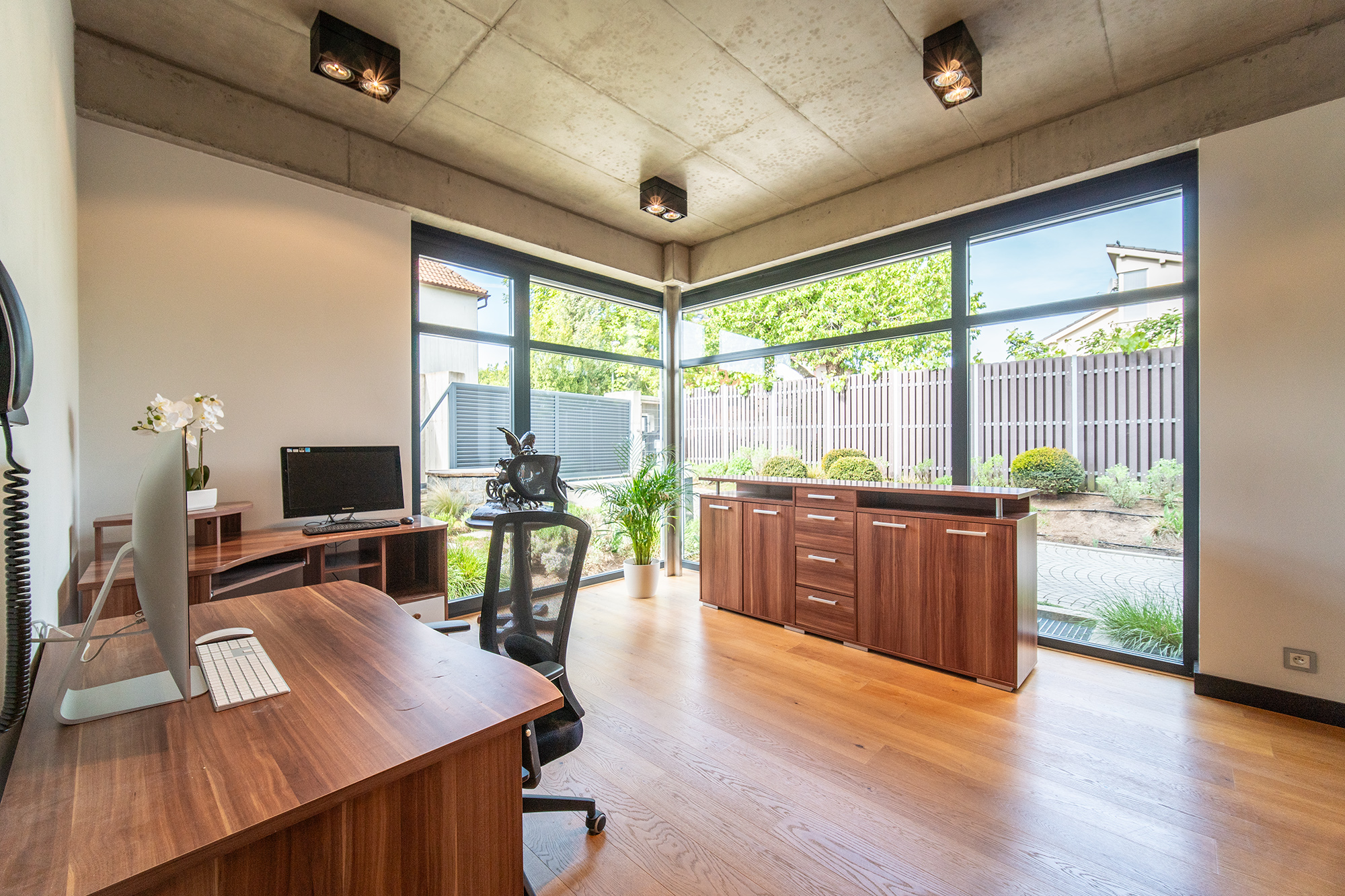 V 1. NP jsou prostory charakterově společného užívání. Hned po vstupu do domu je zádveří s navazující šatnou a pracovnou se samostatným vchodem ven, což je elegantní řešení v případě business využití. K dispozici je toaleta a oddělená koupelna, prosklený výtah zn. Schindler.