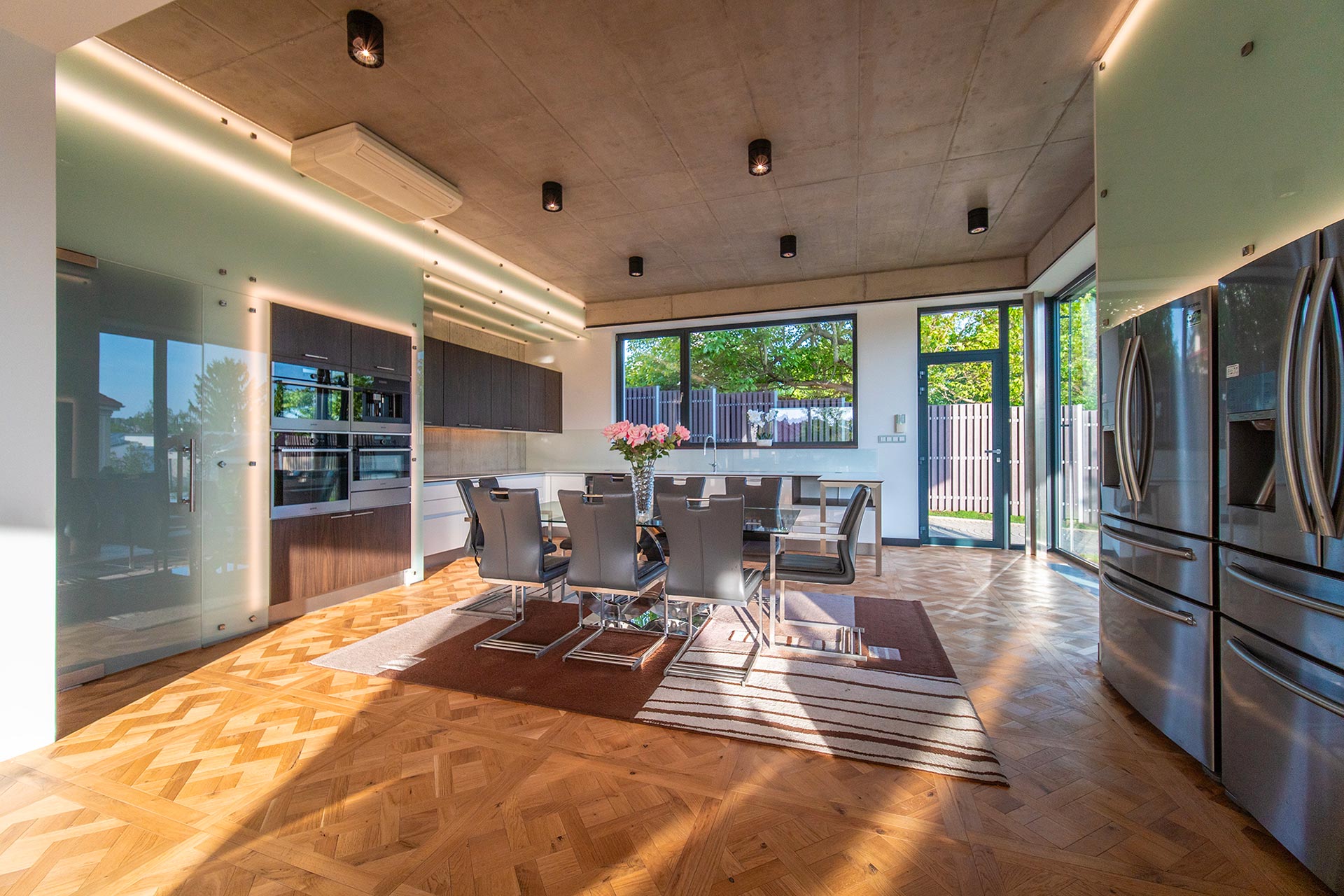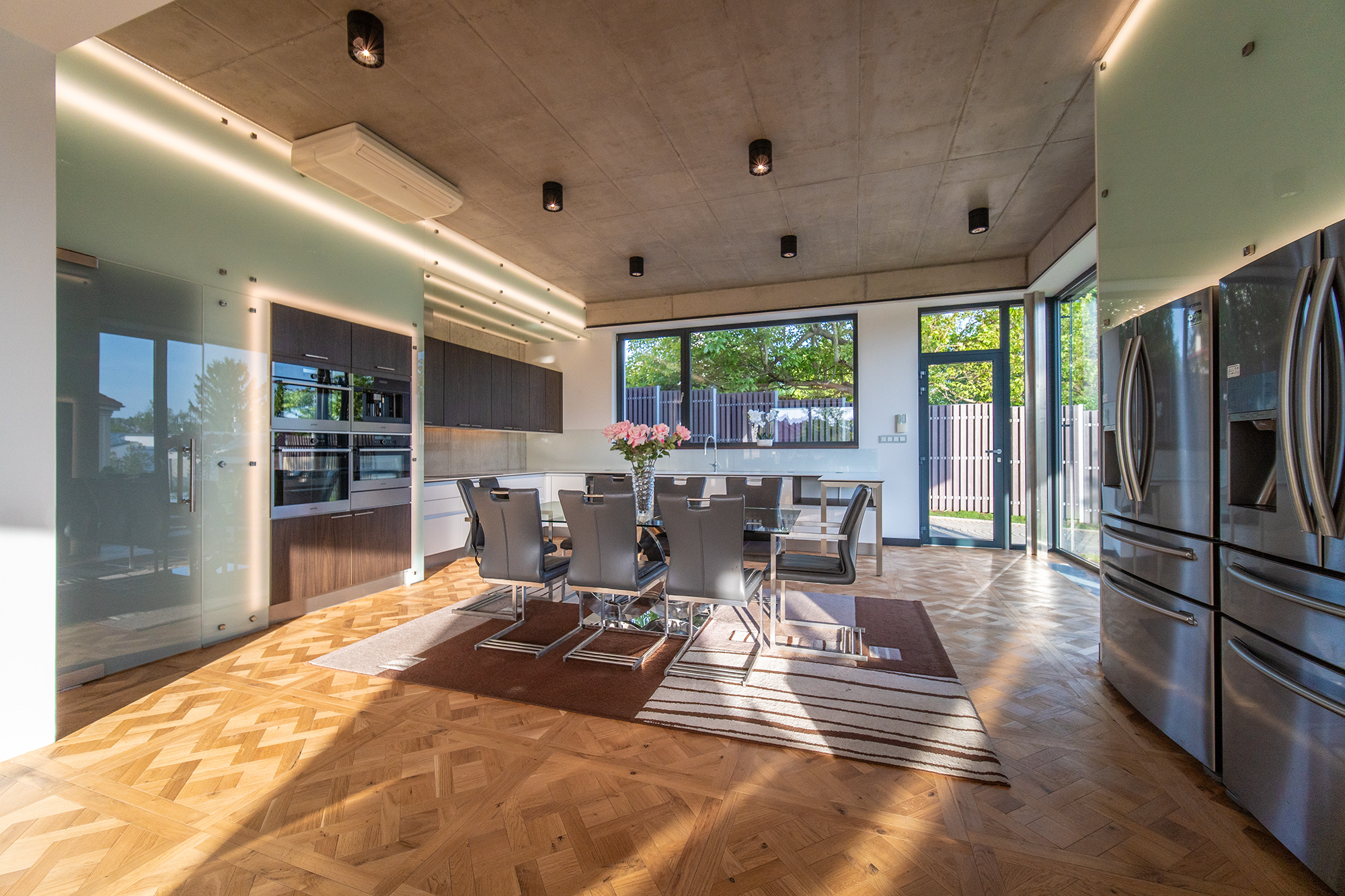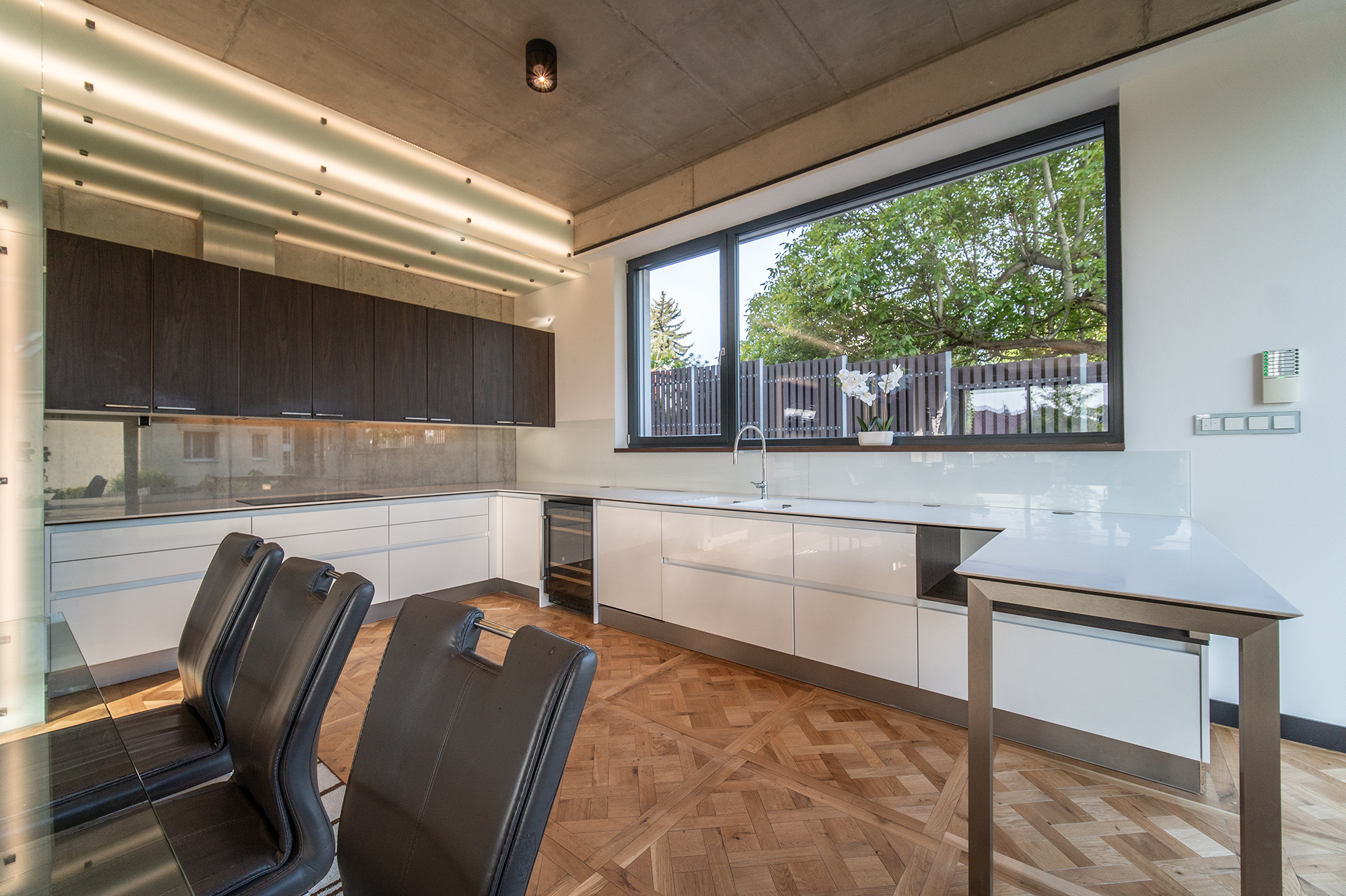 Obývací prostor s kuchyní je nádherně prosvětlený, díky oknům přes celý prostor s výhledem do zelené zahrady. Na podlaze jsou dřevěné velkormátové kazety zn.Empiri.