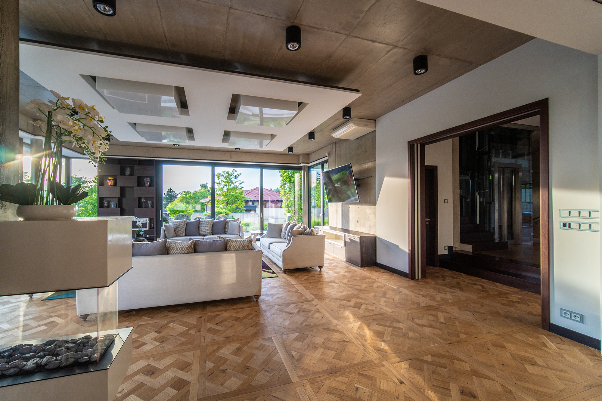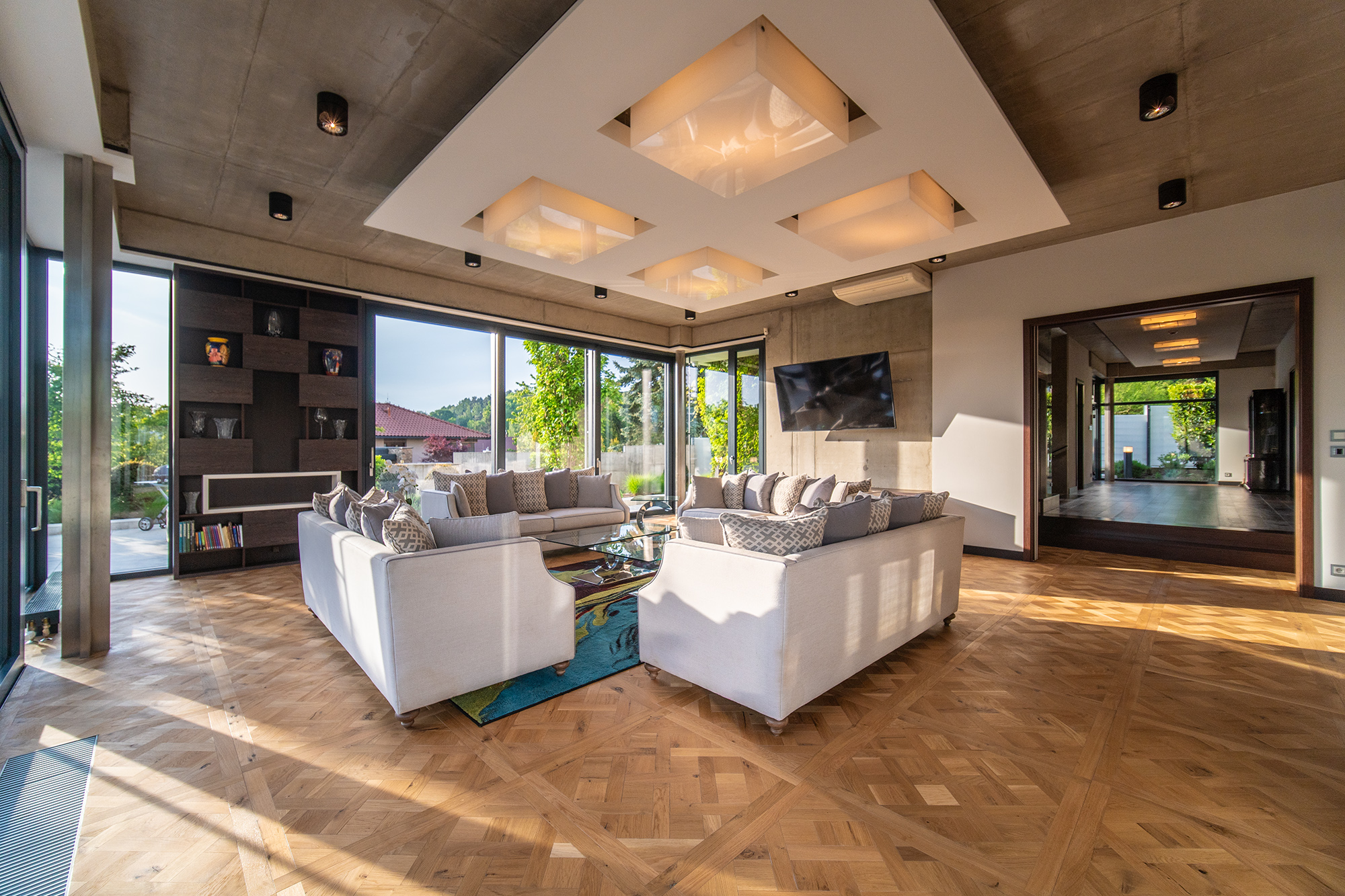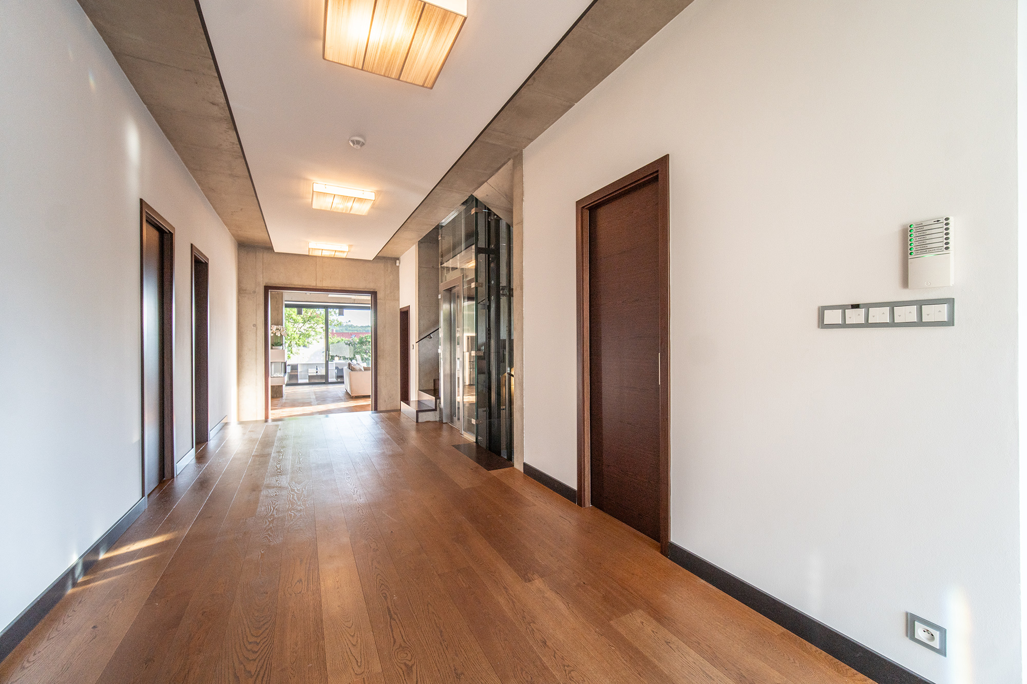 Dům má vyšší stropy, v obývacím pokoji s kuchyní je výška stropu ještě zdůrazněna 2 schody navíc k optickému vyrovnání prostoru plochy. Podlahy v celém objektu kromě suterénu a koupelen jsou z přírodního dřeva.