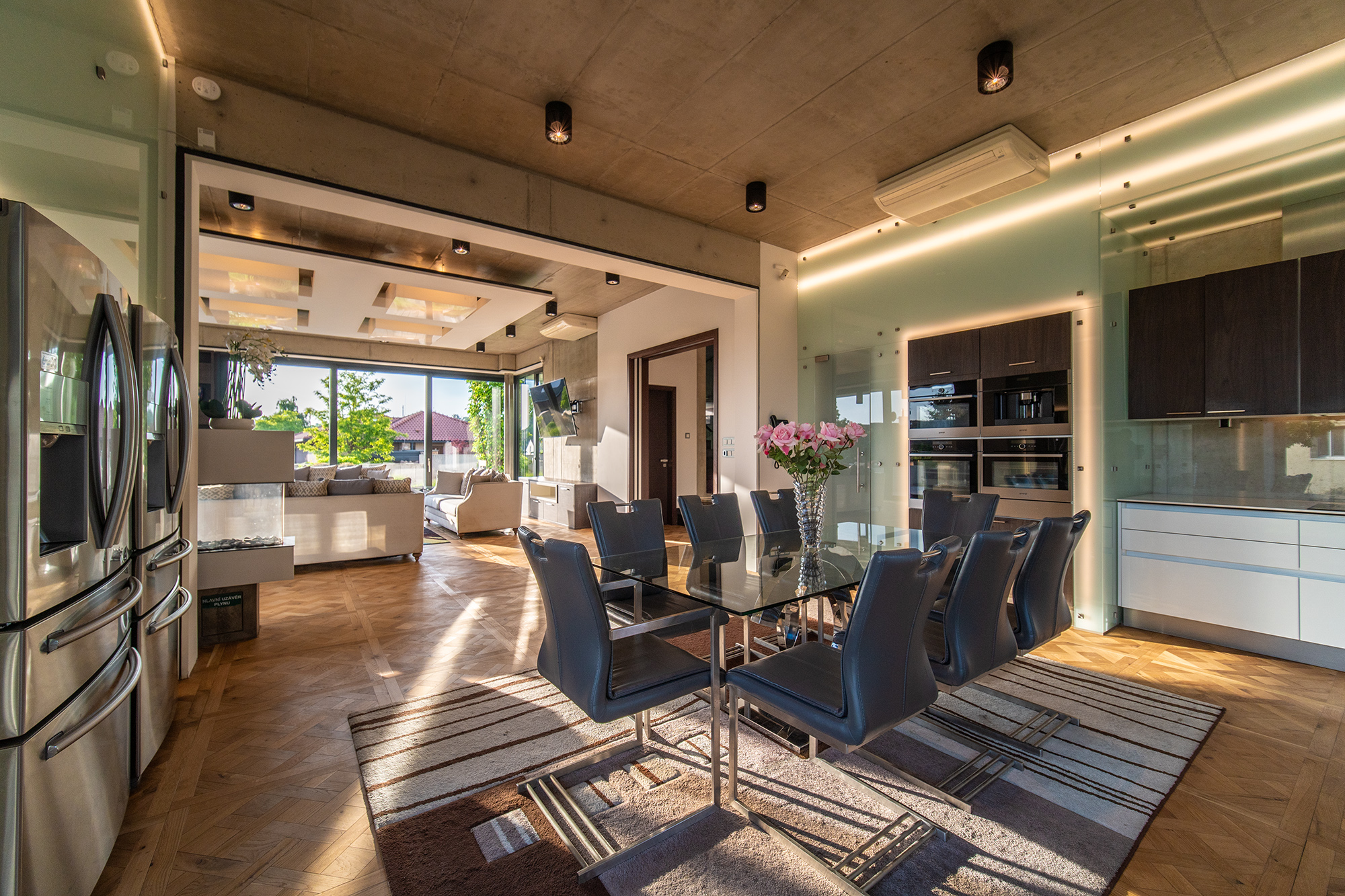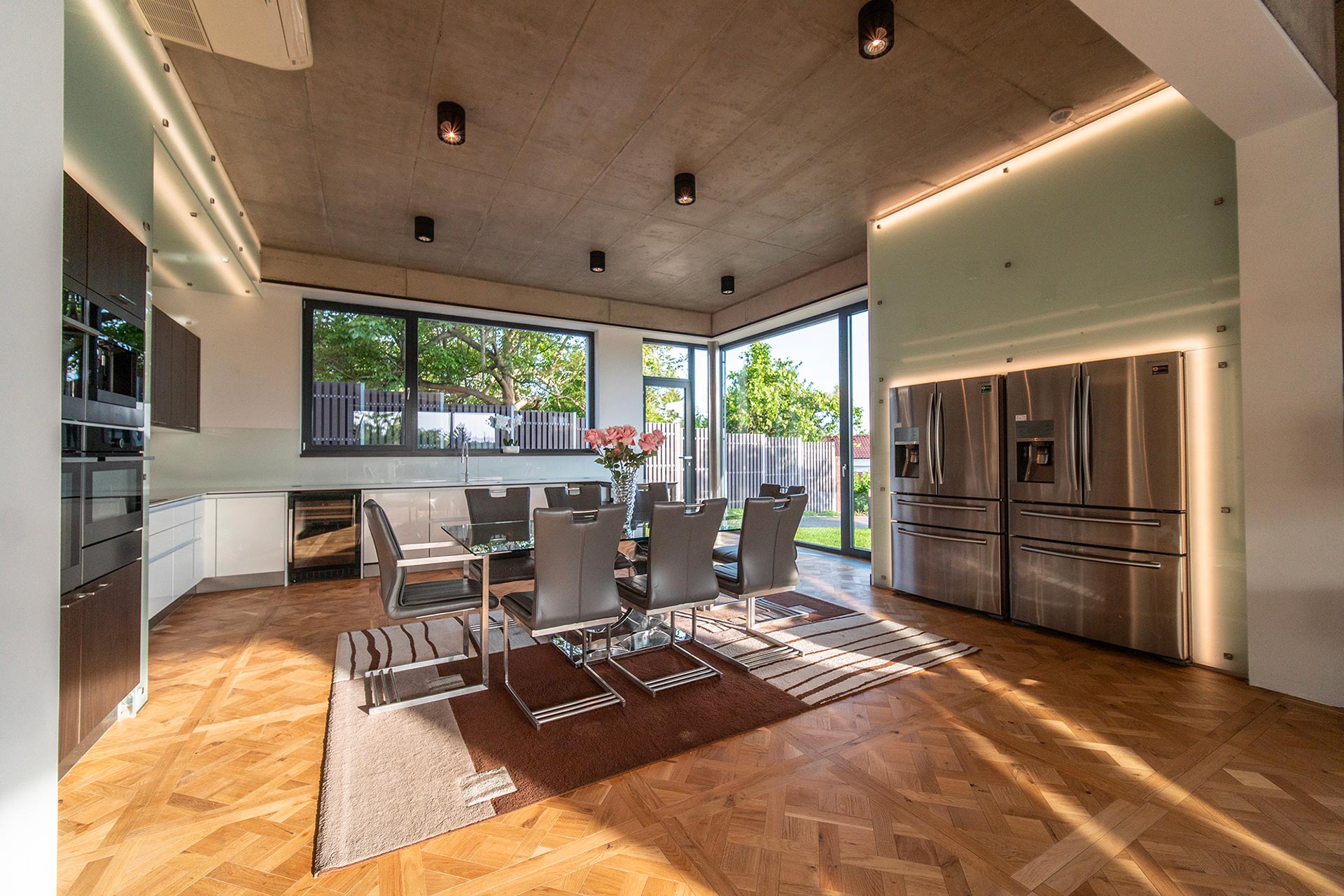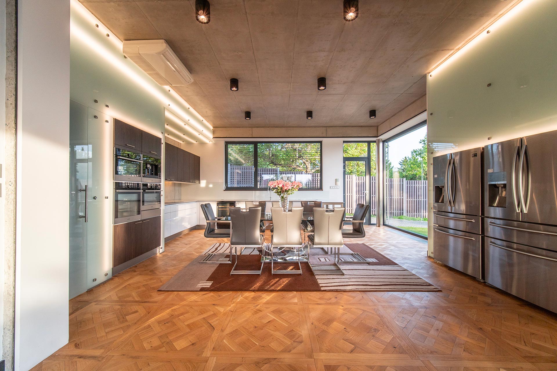 Kuchyňská linka nabízí velké množství úložných prostor, skleněných prvků, zabudovaný kávovar, spíž, 2x americkou lednici, vinotéku. V kuchyni je velkorysý jídelní prostor pro více lidí.