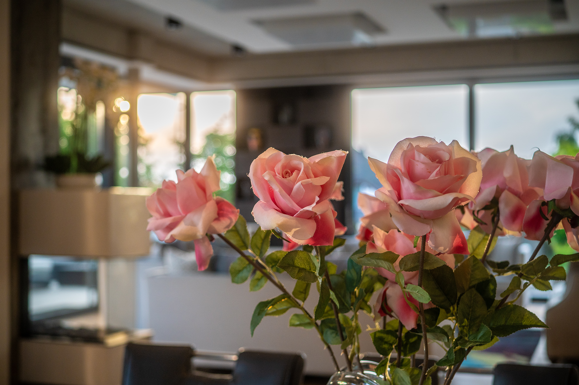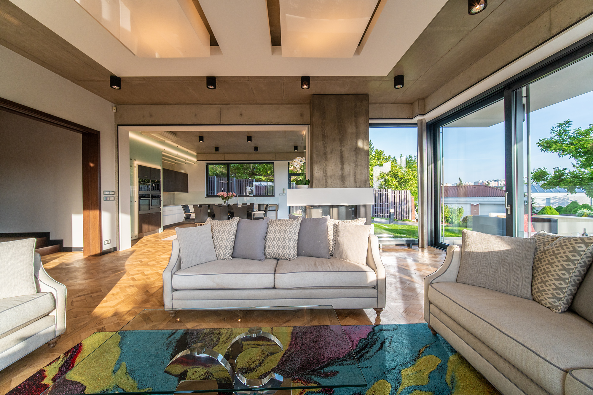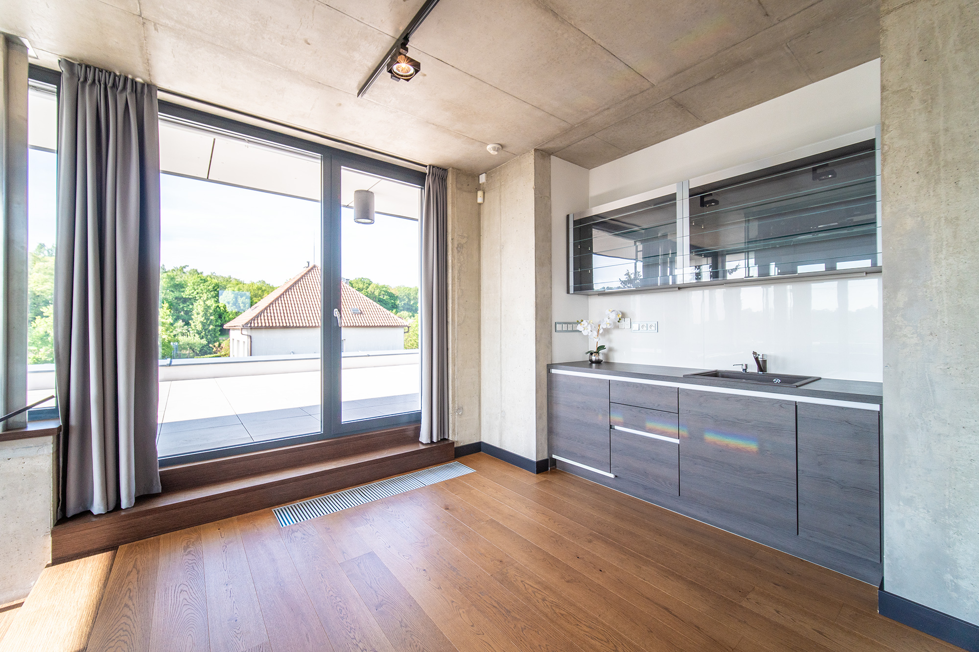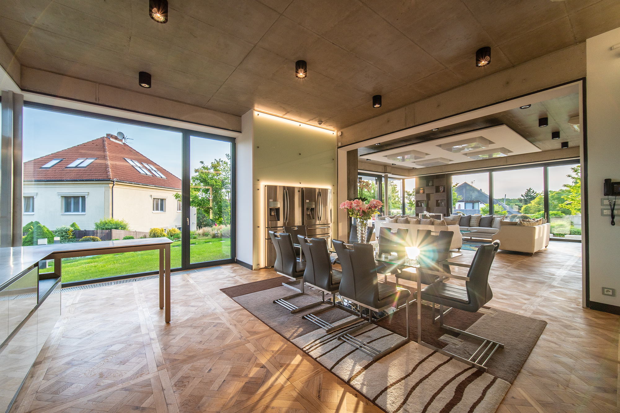 Eleganci celého prostoru dokresluje plynový designový krb viditelný z kuchyně i obývacího pokoje.