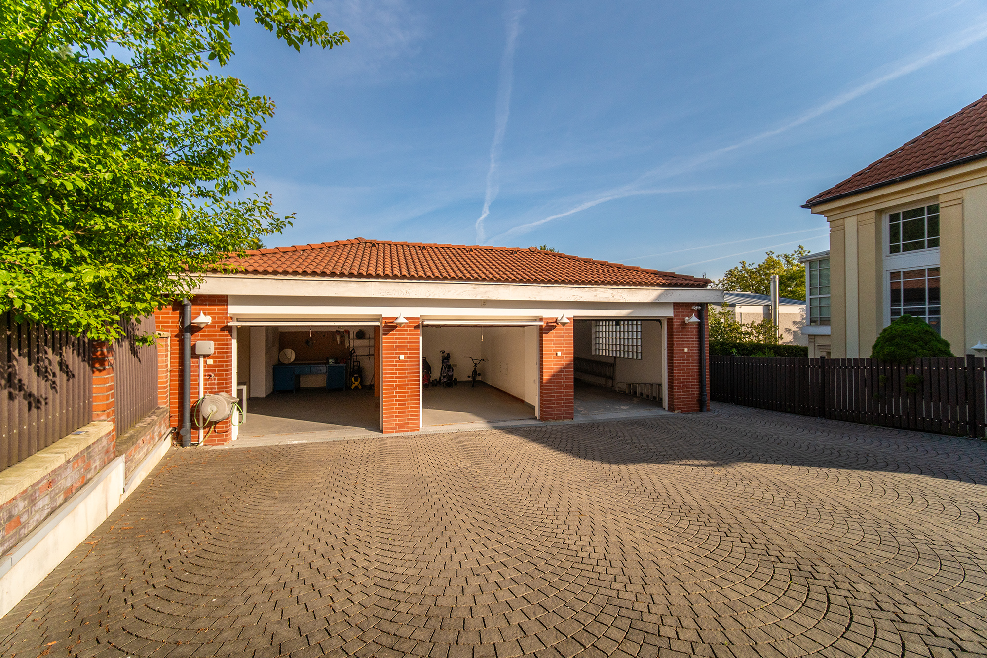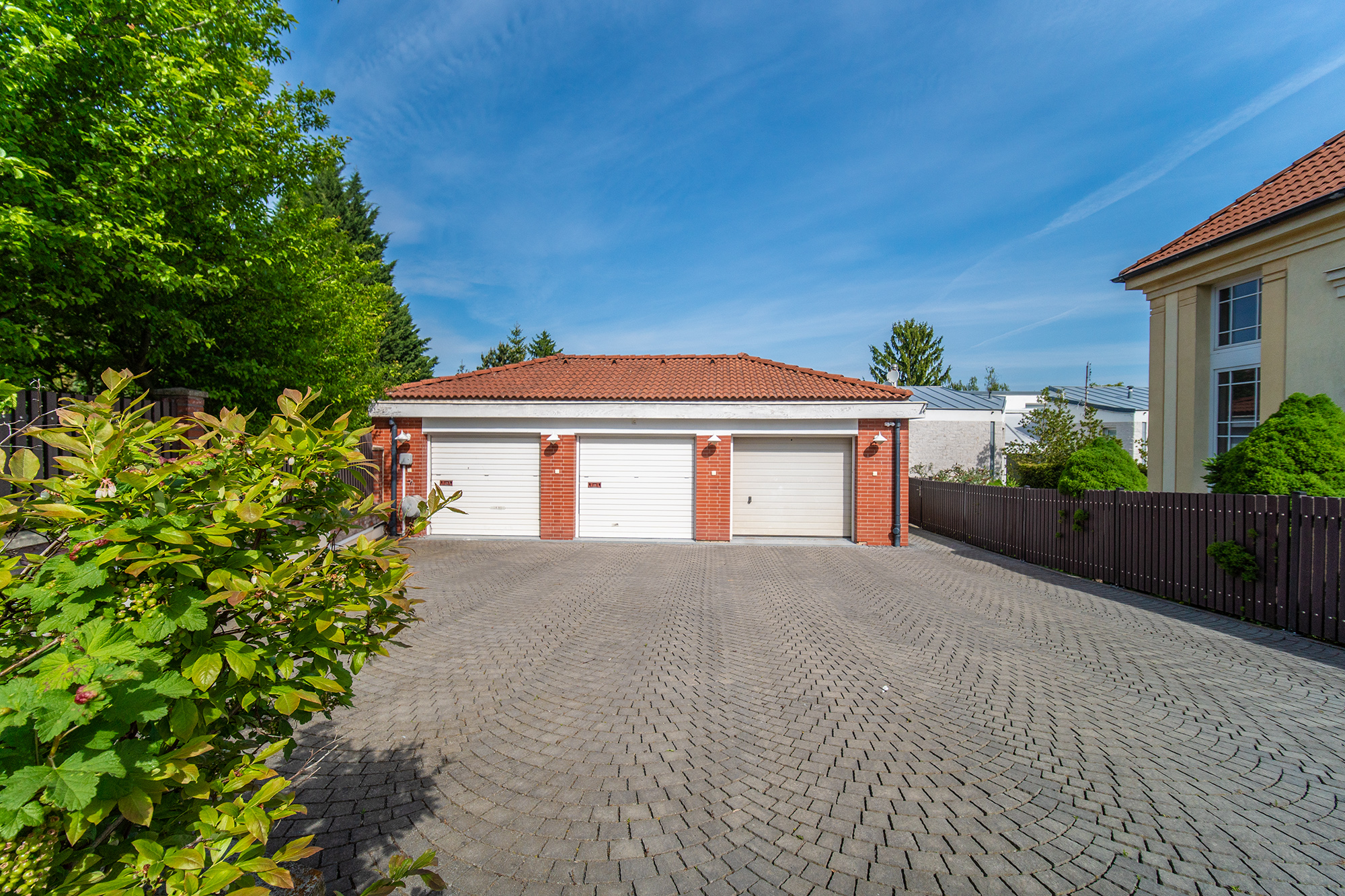 Samostatným objektem je pak jednopodlažní stavba garáže (pro tři vozy) tři oddělené, samostatně přístupné. Jedna z garáží má multifunkční využití dílny a WC. Celá příjezdová cesta ke garáži je doplněna nadstandardním osvětlením.