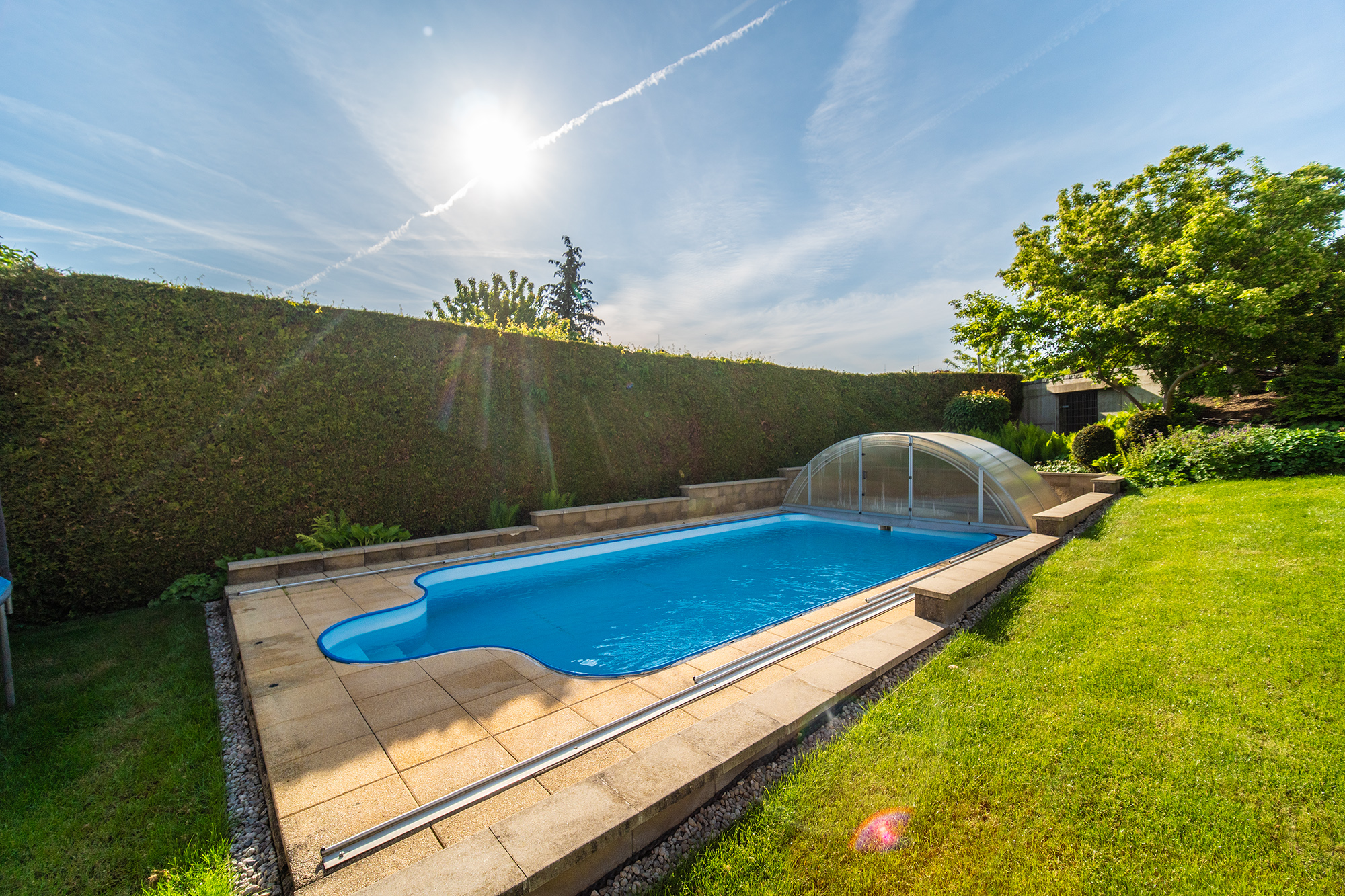 Bazén je foliový, rozměr 3,5 x 7m, hloubka 1,2m, s fóliovým zastřešením, tepelným ohřevem a automatickou filtrací.