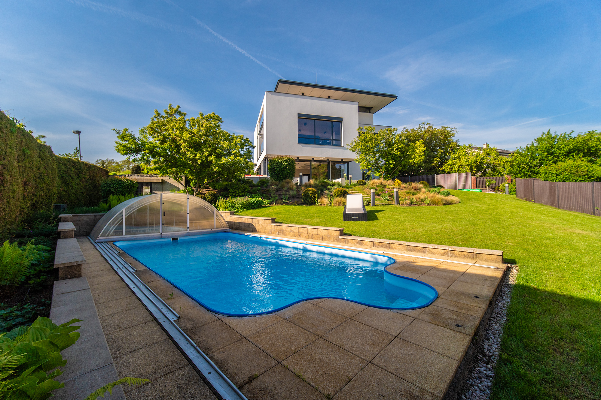 Dále je zde do terénu částečně zapuštěná samostatná drobná stavba s plochou střechou provedená z monolitického betonu pro zahradní náčiní, sezení při bazénu atp.