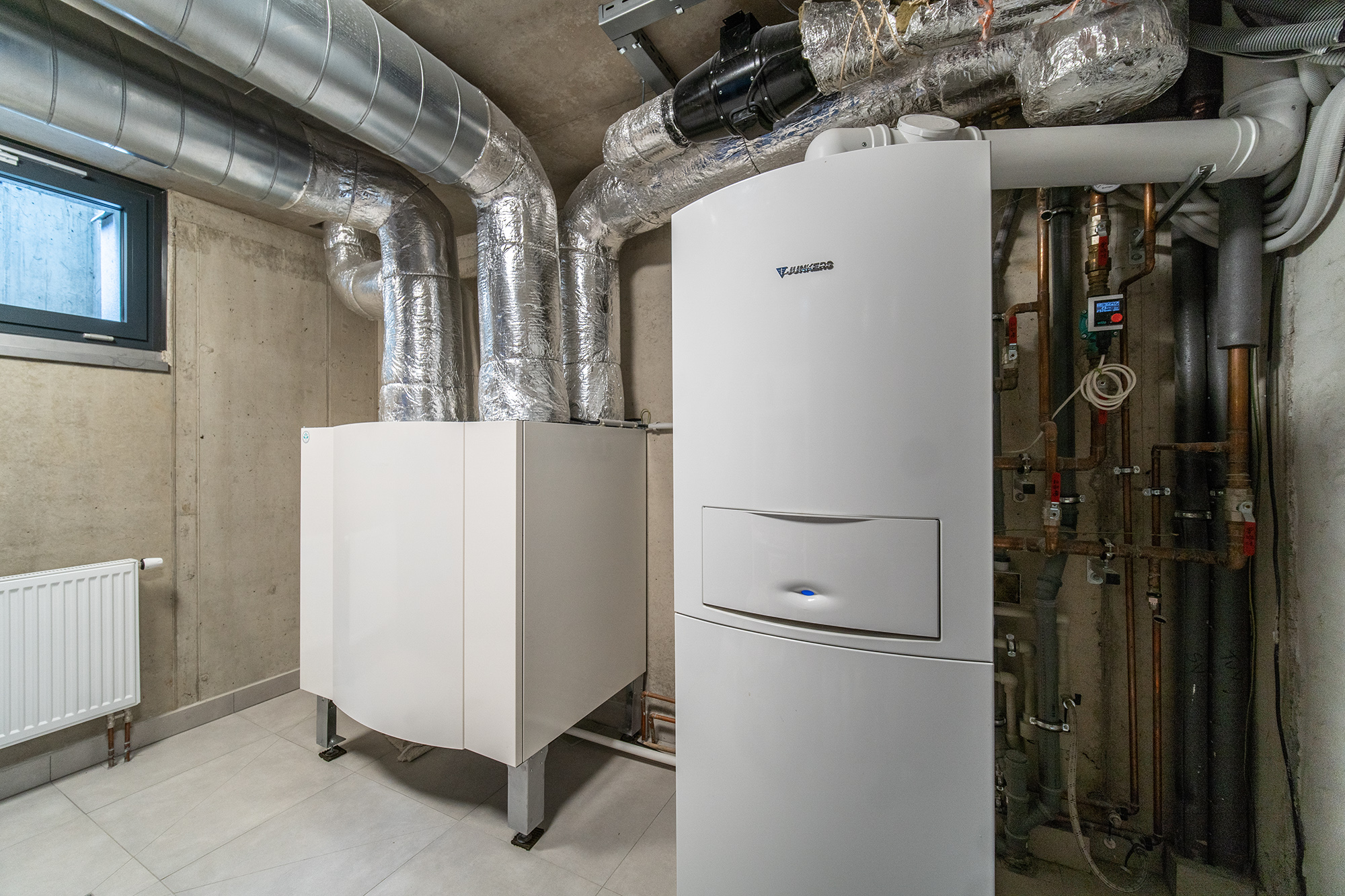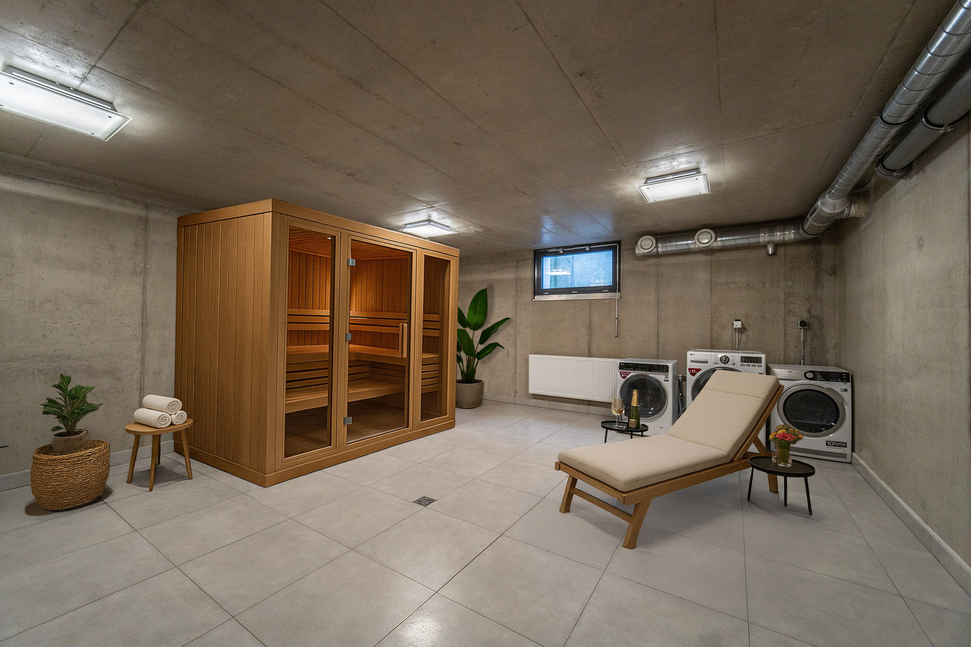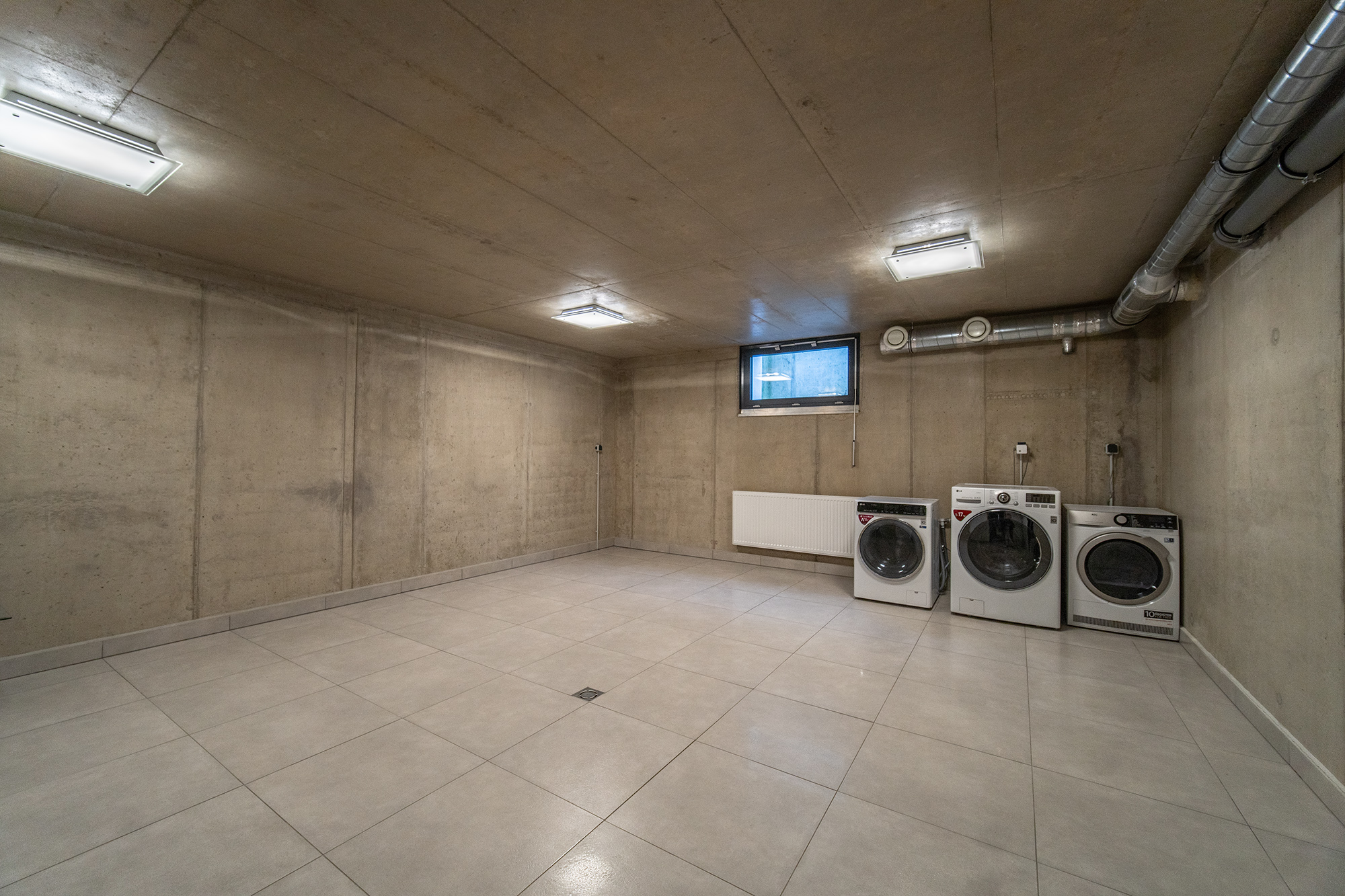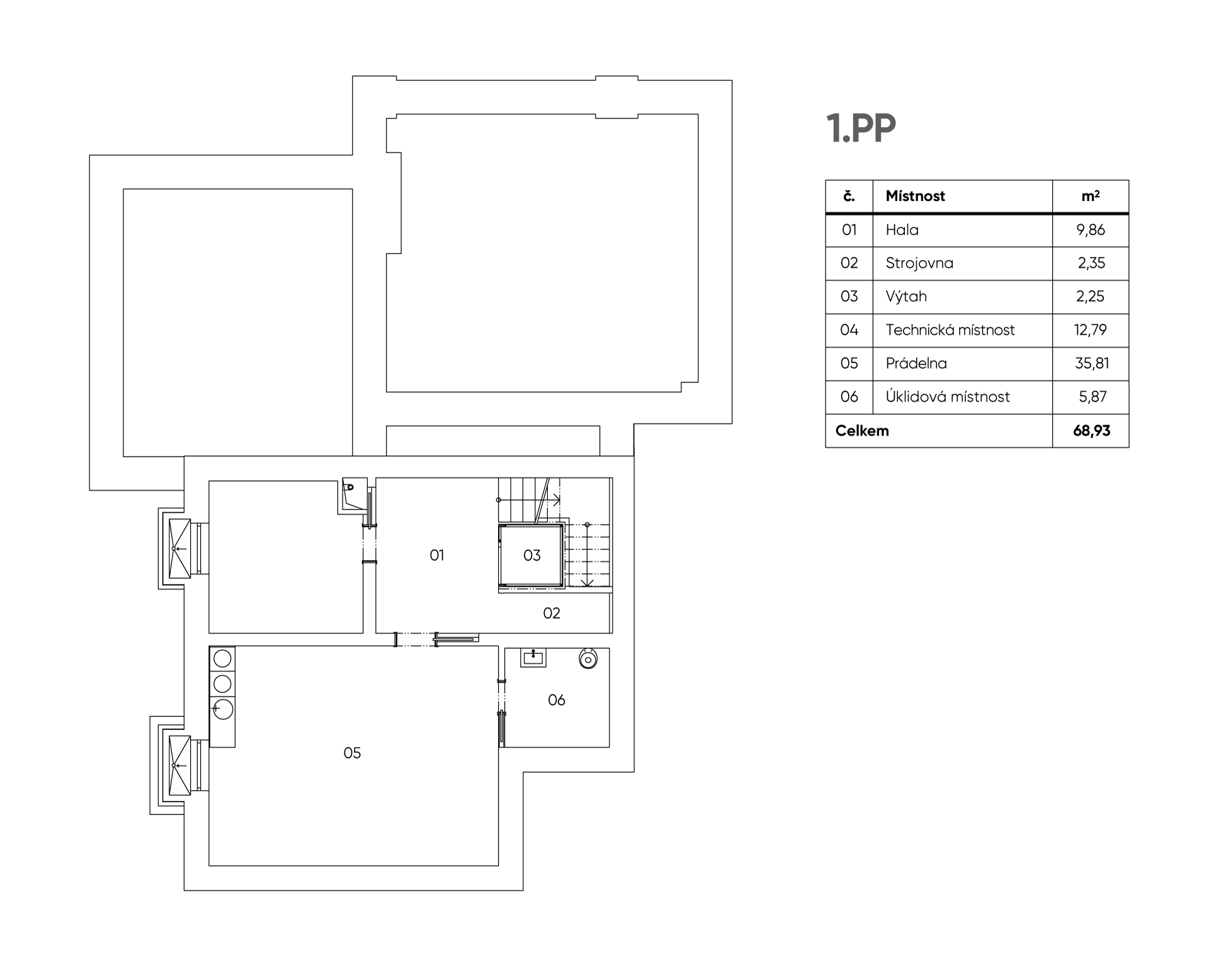 V 1. PP (pod částí stavby) s užitnou plochou místností 69,98 m2 jsou technické místnosti převážně s podlahami tvořenými velkoformátovou dlažbou a úpravou stěn pohledovým betonem. Dále úklidová místnost s WC, kotelna celého domu.