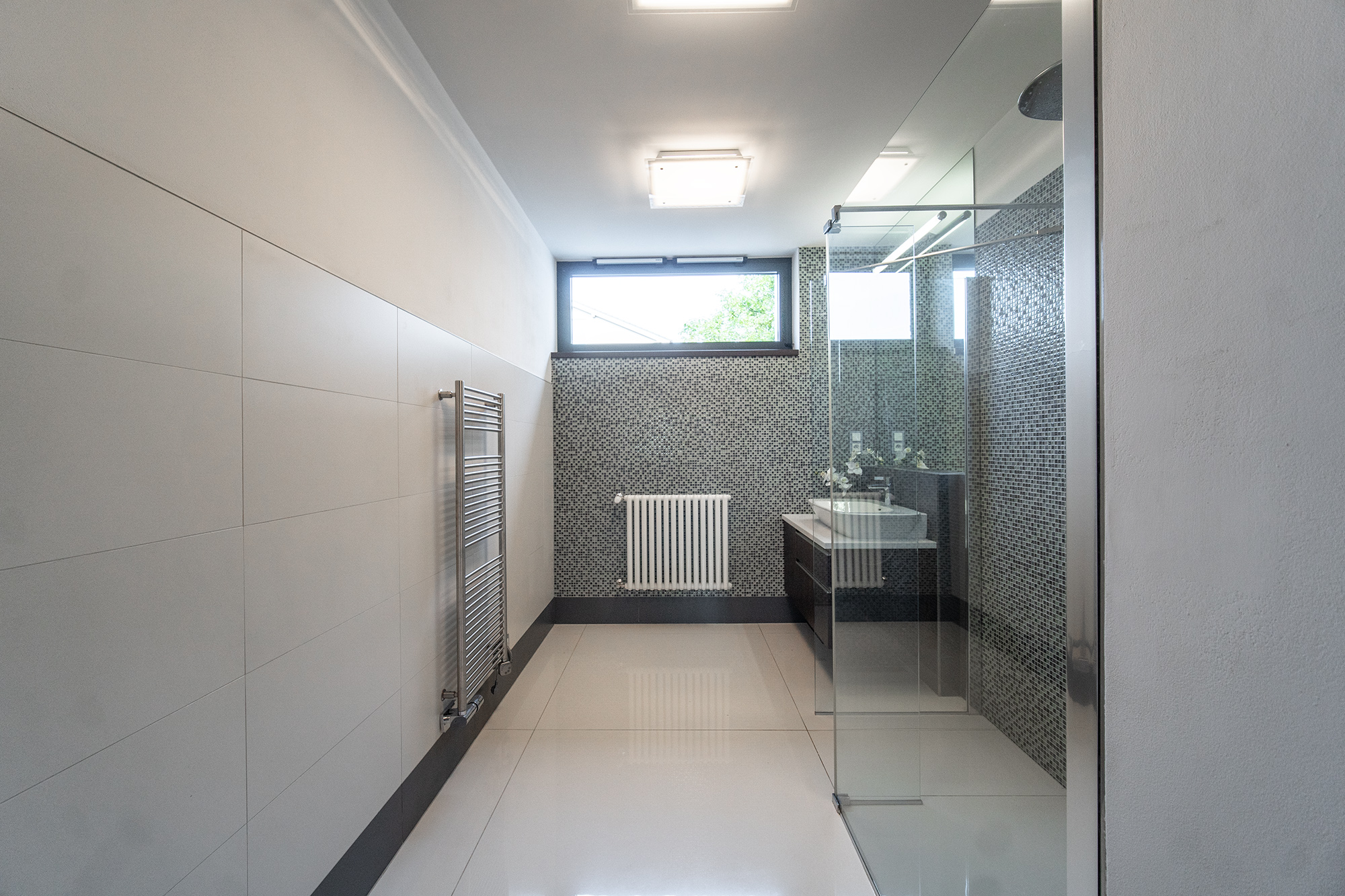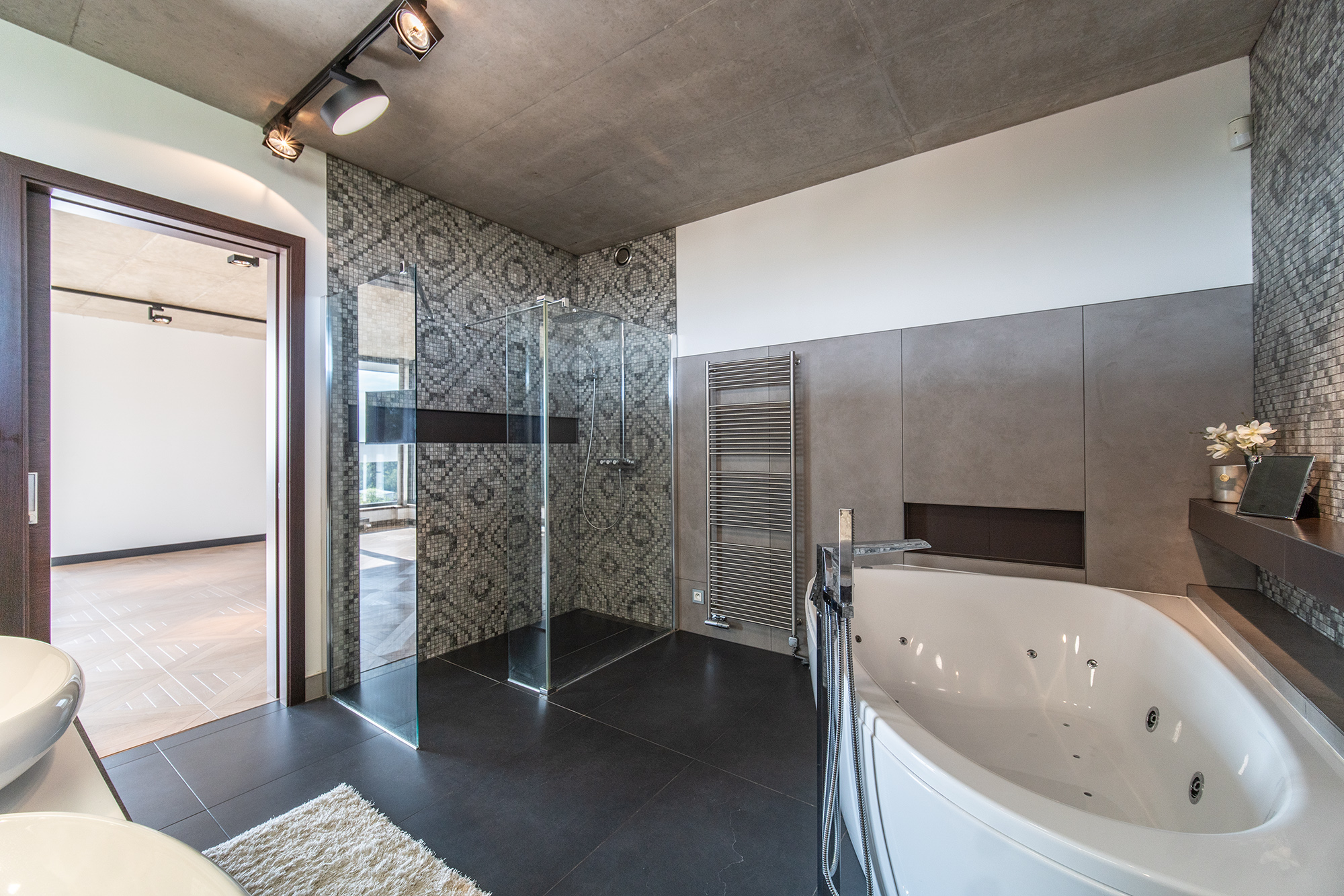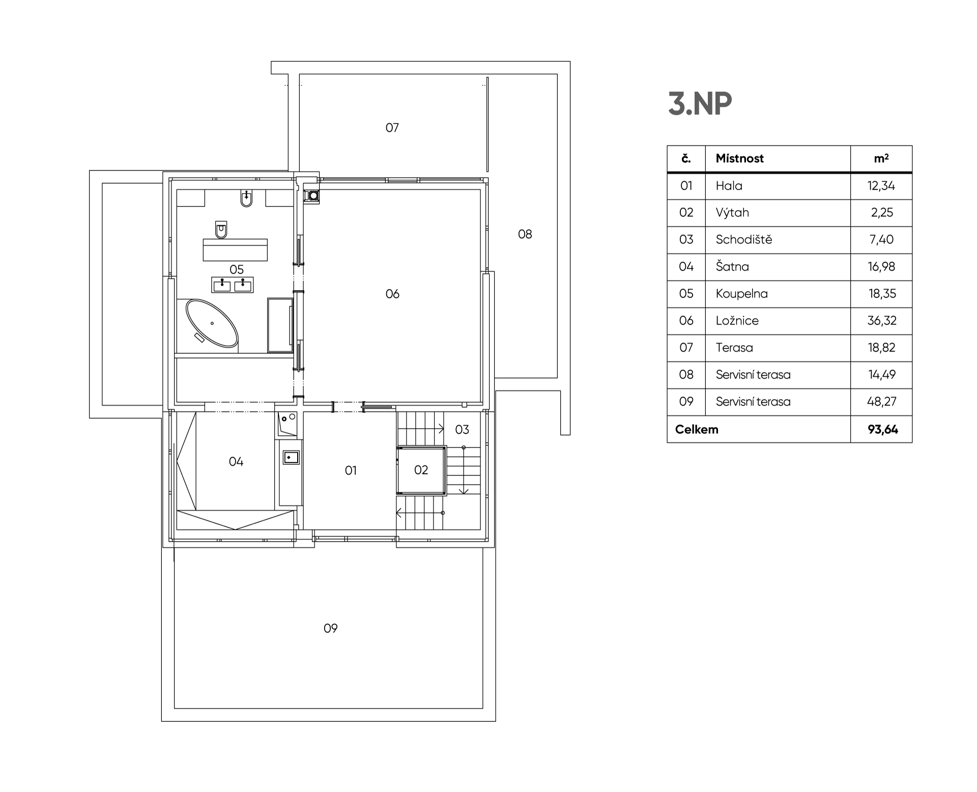 Ve 3. NP je opravdu velkorysé „master berdroom“, (36 m2) s koupelnou s rohovou vanou, sprchovým koutem a velkorysou samostatnou šatnou.