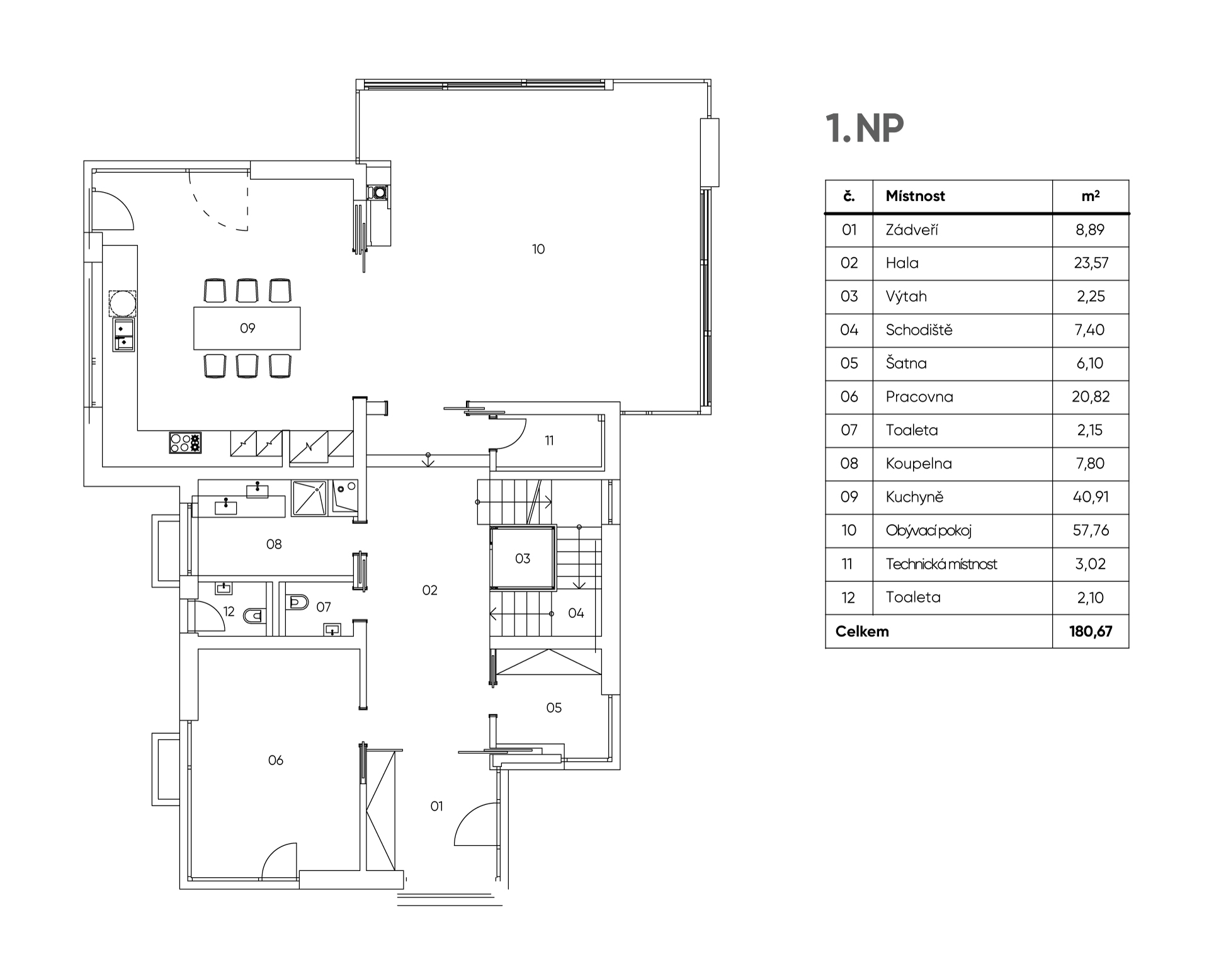 Hostovský pokoj/pracovna, koupelna, 2× WC (1× venkovní), šatna, velkorysý obývací prostor s kuchyní 99 m² |