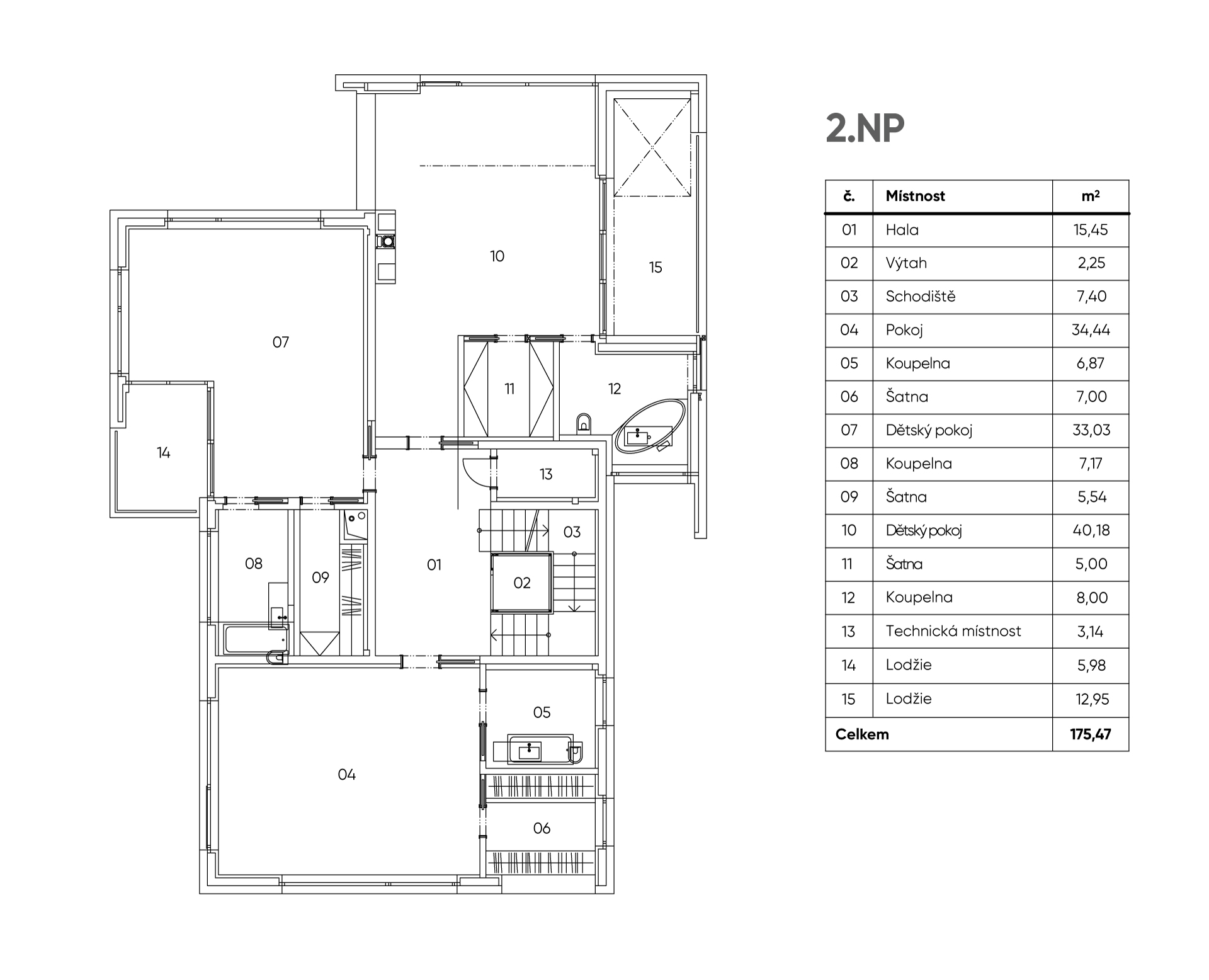 Ve 2. NP jsou tři prostorné pokoje. Každý pokoj má vlastní koupelnu a samostatnou šatnu. 2 pokoje mají vlastní lodžii, přičemž jedna lodžie disponuje italskou, elektricky ovládanou rolovací střechou. Jeden z pokojů má domácí kino. K dispozici na patře je i technická místnost.